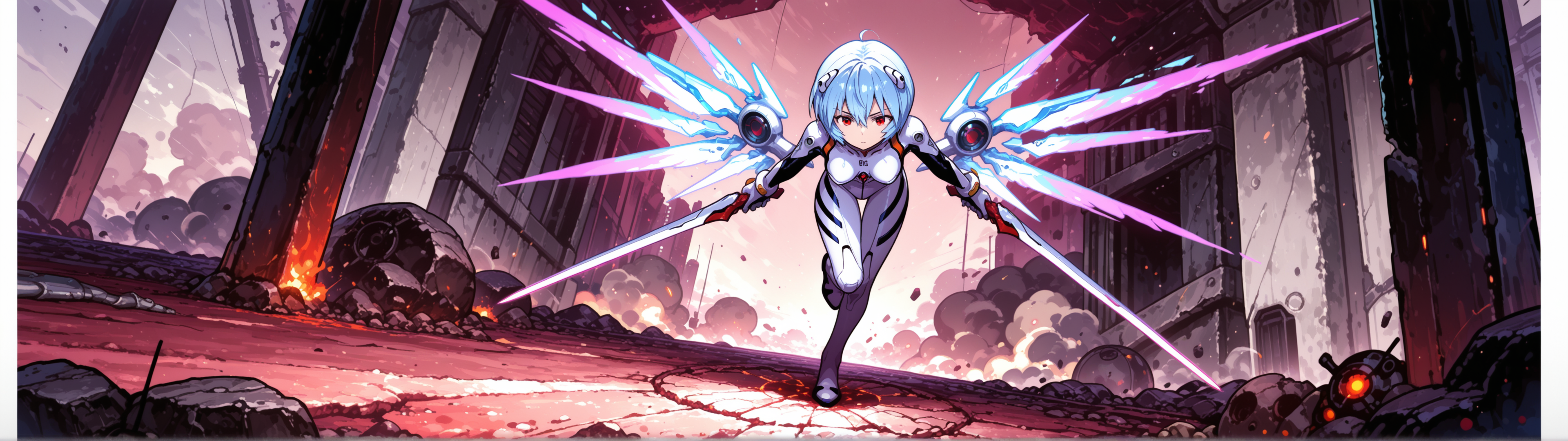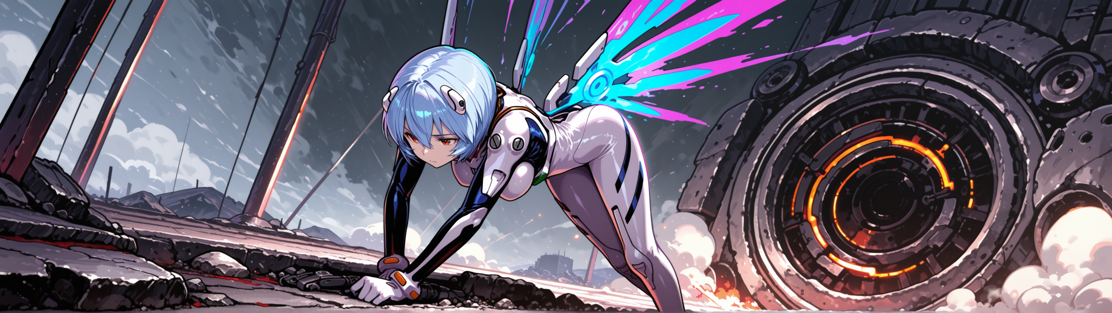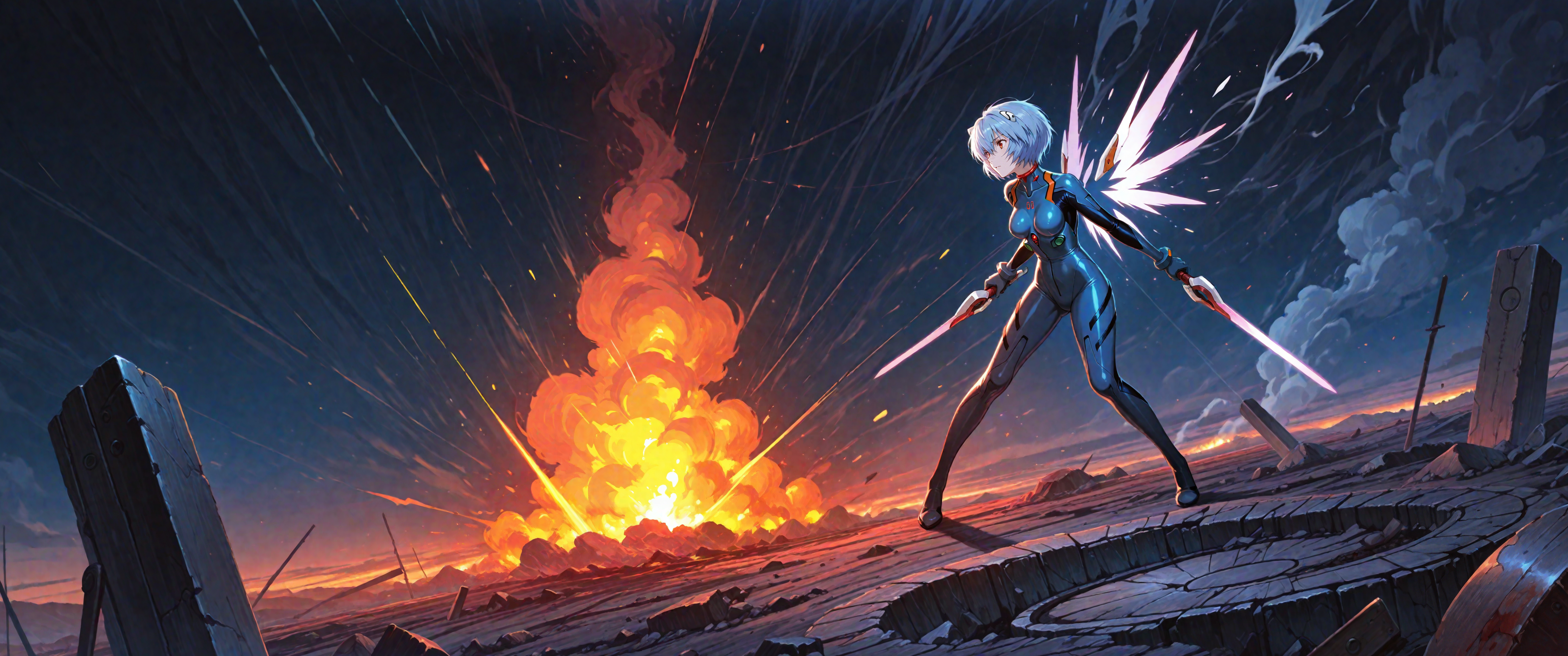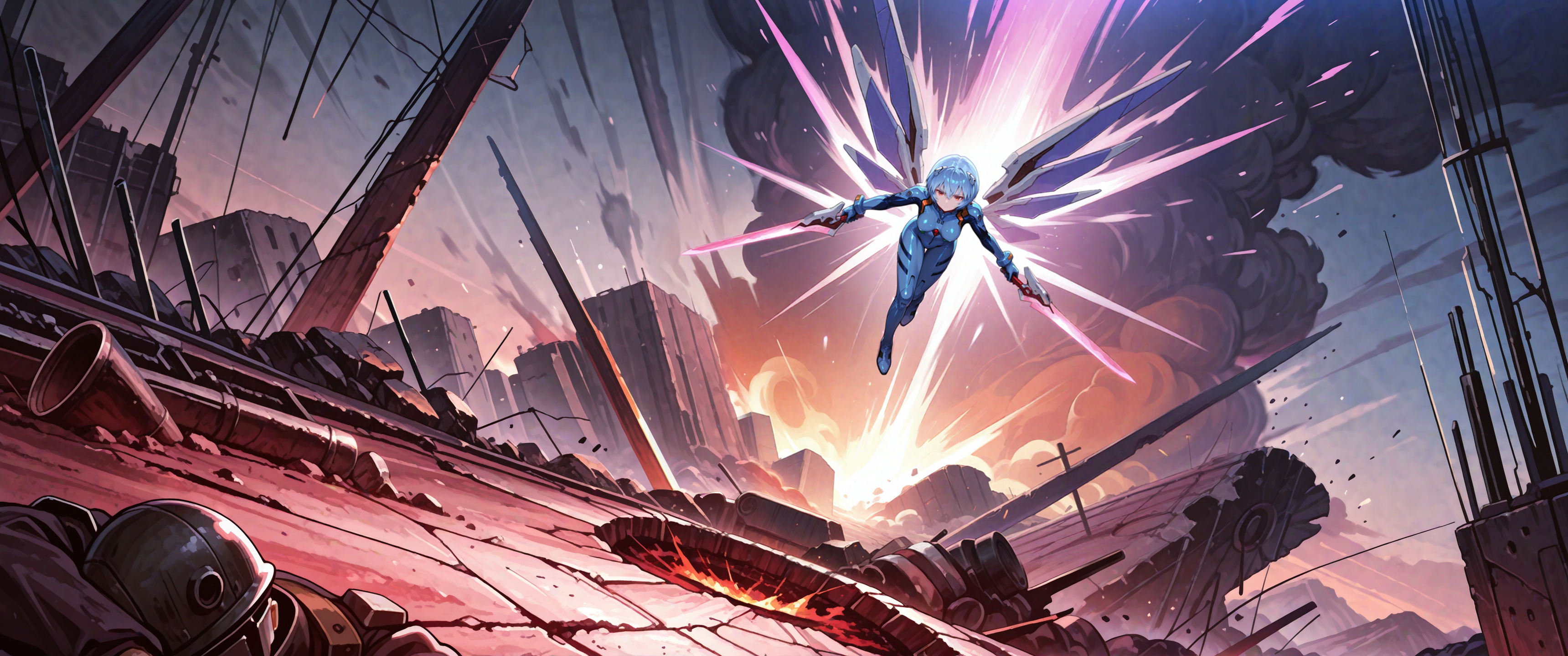 Пришла пора генерировать картинки из фанфиков, картинки из фанфиков сами себя не сгенерируют. В небе звонко хрустнуло, будто кто-то сломал огромный кусок стекла, и я невольно подняла глаза. Из дымного облака, которое все плакало горящими ошметками катера, к земле опускалось пылающее синевой распятие. Широко раскинув руки и запрокинув голову, в ореоле крылатого свечения на поле боя падал последний гвардеец Его Тени. Зеро. Аянами ускорилась метров за двадцать до земли и приземлилась так, что плита перекрытия вздрогнула, а ближайшего солдата вскинуло и порвало в кровавую пыль. «Мать вашу, она еще и боевой энергетик». Сплошное сияние померкло, и, бросив один только взгляд в нашу сторону, Рей развернулась к солдатам. Рогатые наросты на спине ее скафандра взорвались дымом, и короткие кривые клинки сгустились в руках Аянами. Поднятый на лифте легкий БТР она, похоже, решила пока игнорировать.