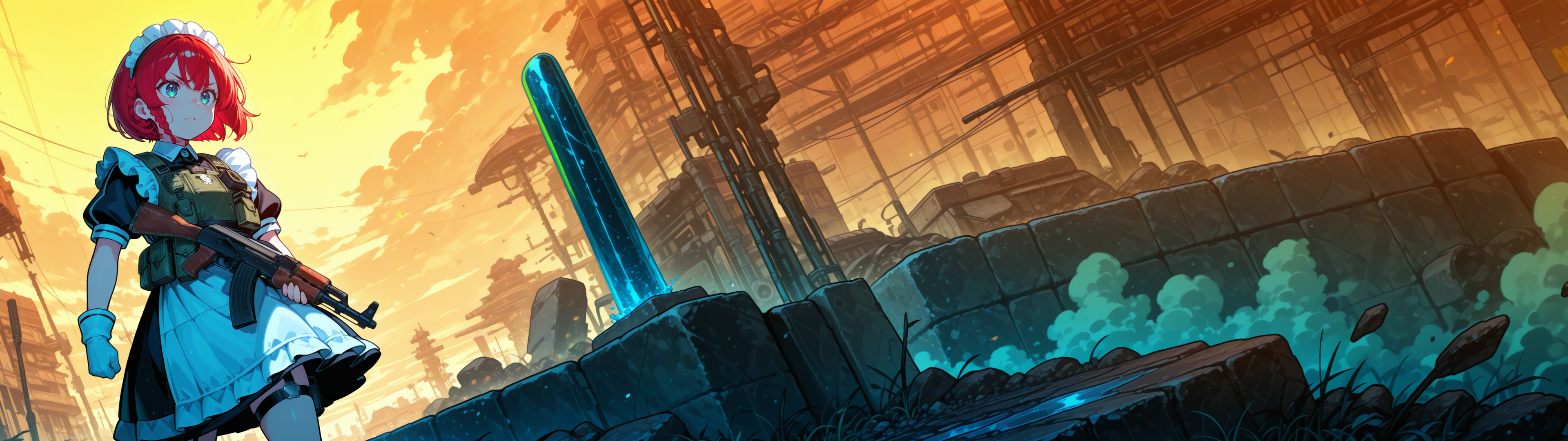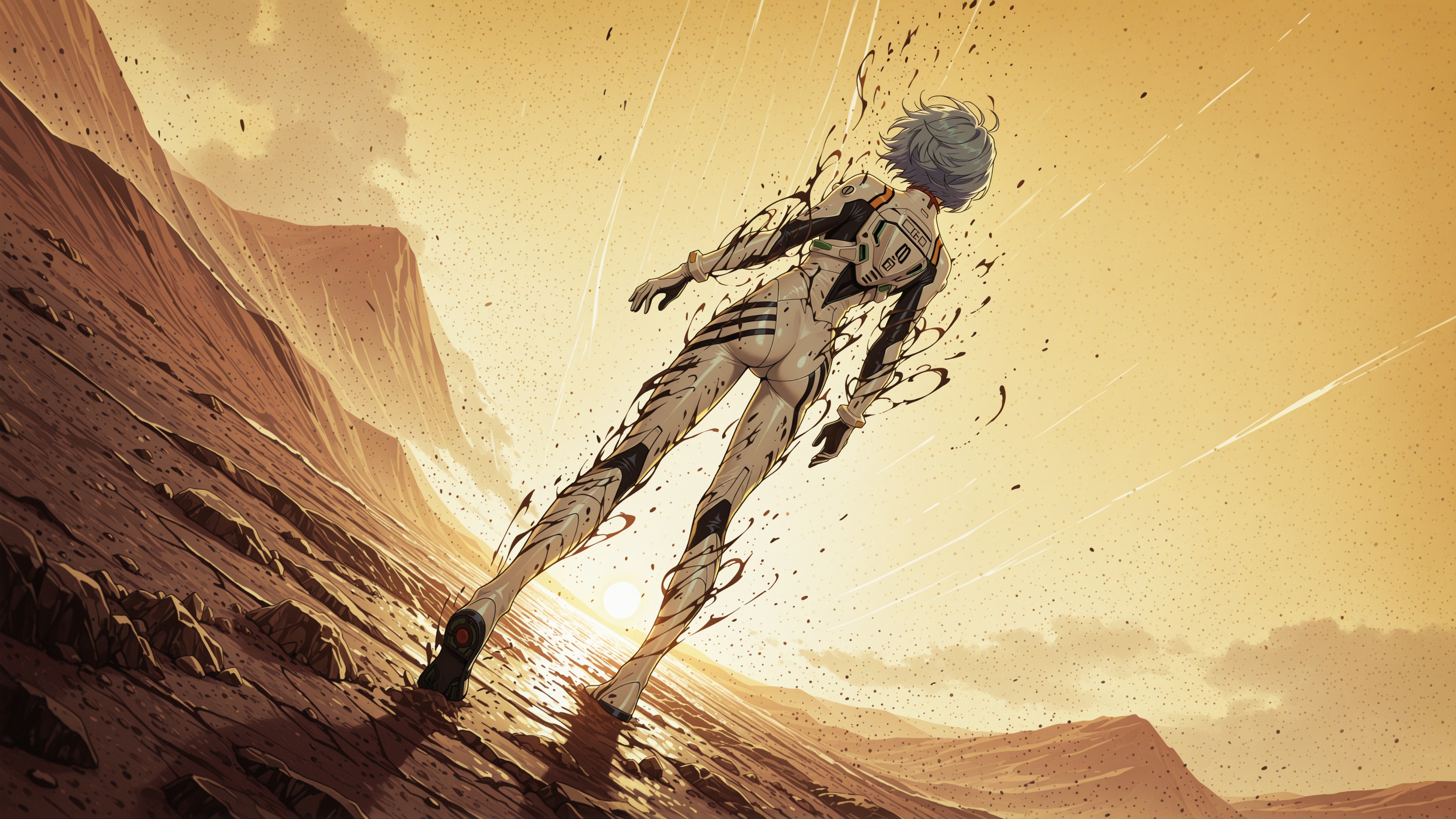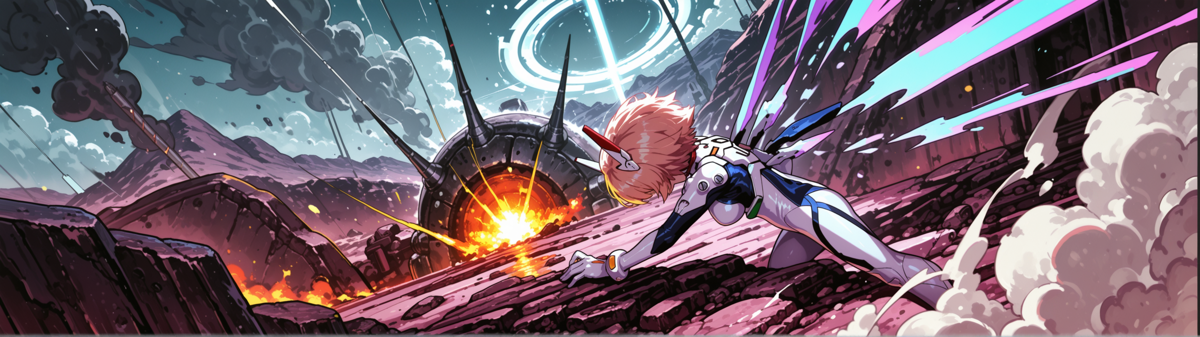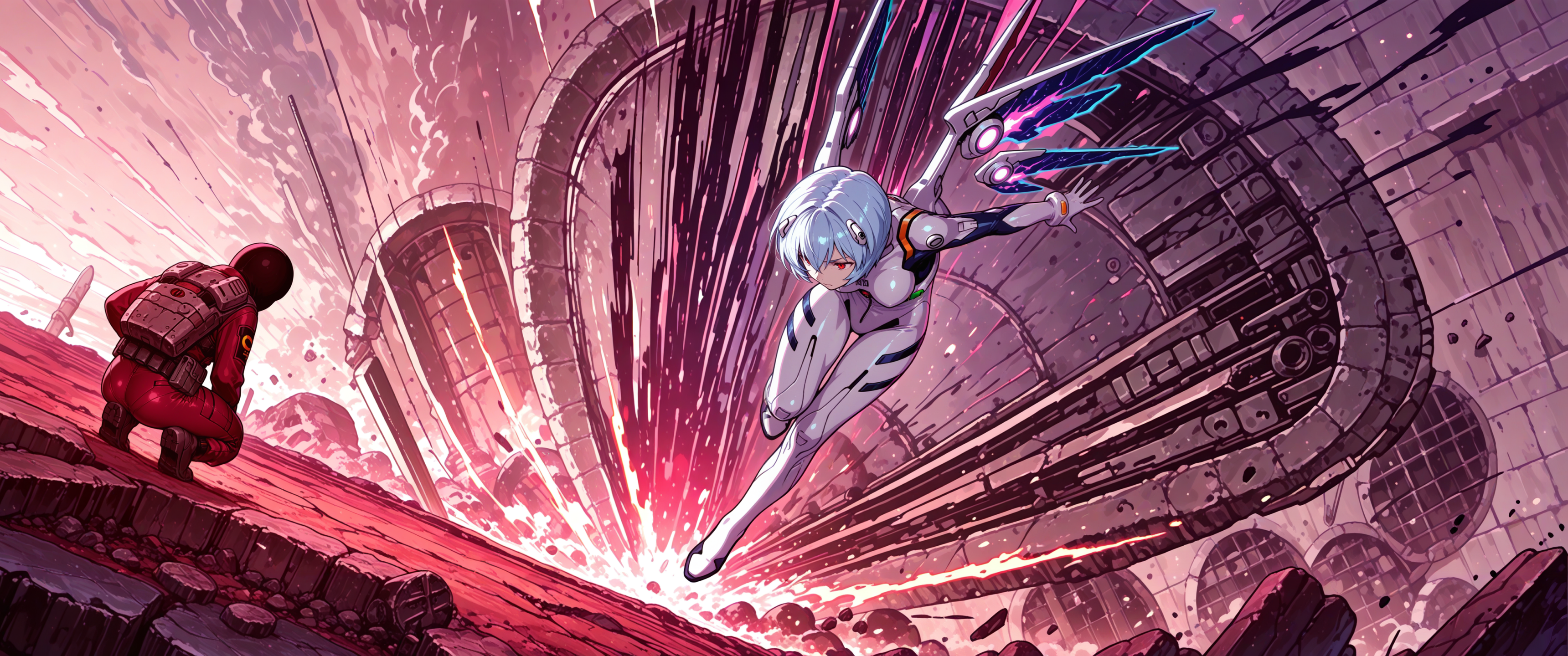 Пришла пора генерировать картинки из фанфиков, картинки из фанфиков сами себя не сгенерируют. В небе звонко хрустнуло, будто кто-то сломал огромный кусок стекла, и я невольно подняла глаза. Из дымного облака, которое все плакало горящими ошметками катера, к земле опускалось пылающее синевой распятие. Широко раскинув руки и запрокинув голову, в ореоле крылатого свечения на поле боя падал последний гвардеец Его Тени. Зеро. Аянами ускорилась метров за двадцать до земли и приземлилась так, что плита перекрытия вздрогнула, а ближайшего солдата вскинуло и порвало в кровавую пыль. «Мать вашу, она еще и боевой энергетик». Сплошное сияние померкло, и, бросив один только взгляд в нашу сторону, Рей развернулась к солдатам. Рогатые наросты на спине ее скафандра взорвались дымом, и короткие кривые клинки сгустились в руках Аянами. Поднятый на лифте легкий БТР она, похоже, решила пока игнорировать.