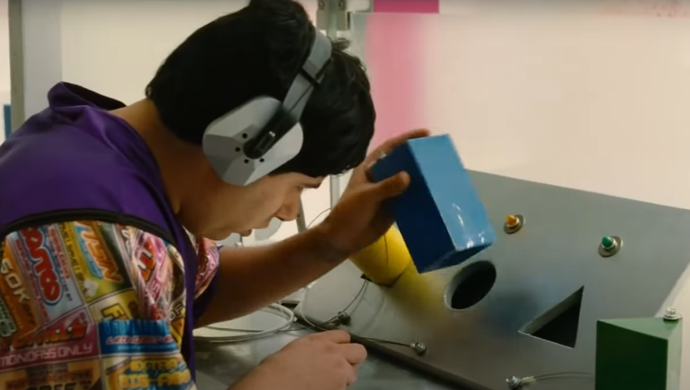 top: girl on top of red cube; center:green cube; bottom:blue cube