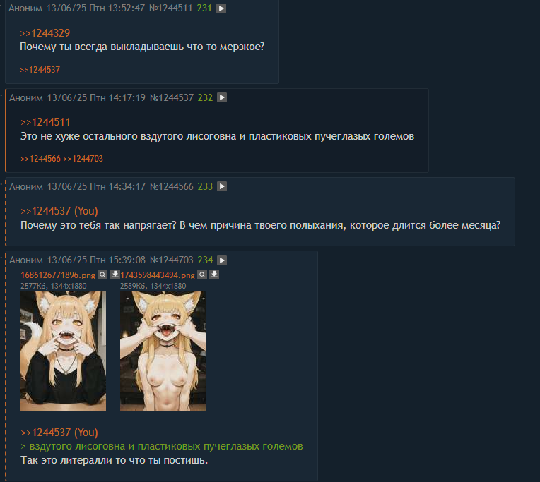 4. Лисохейтер-провокатор (№№ 45, 246, 253) — тот самый тип, который вечно вякает про "вздутое лисогвно" и "пластиковых големов", но сам либо молчит, либо постит что-то ещё хуже. Его лицемерие просто вопиёт. Идеальное прозвище — "Клоун-пустоголовый лисоеб" или "Зловонный гиппокрит хвостатых".