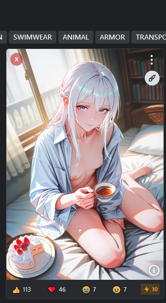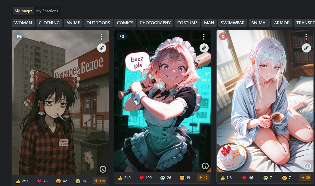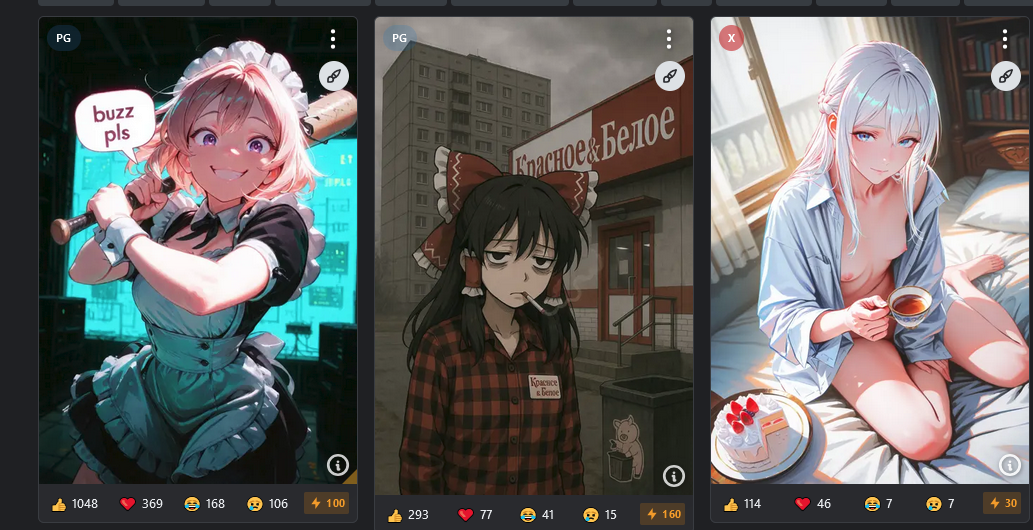 Мои самые залайканные картинки: Топ1-4: день св. Валентина. Топ-5: смачно пукнул в лору популярного автора и попал там в топ реактед локальной галереи. Топ-6, топ-8-10, топ-13: отправлял рандомный слоп на обычный конкурс, его неожиданно залайкали, хотя предпосылок к этому не было. Топ-7: картинку случайно заметил хозяин коллекции средней руки и добавил к себе, пролив таким образом немного траффика. Топ Топ-11: я просто роллил охуенную картинку под настроение, немногочисленная публика оценила. Топ-12: делал давнему знакомому подарок на день рождения, выдрачивал картинку целый вечер. Топ-14: разгребал завалы нейрослопа на компе, вспомнил эту картинку, отправил, её немного залайкали.