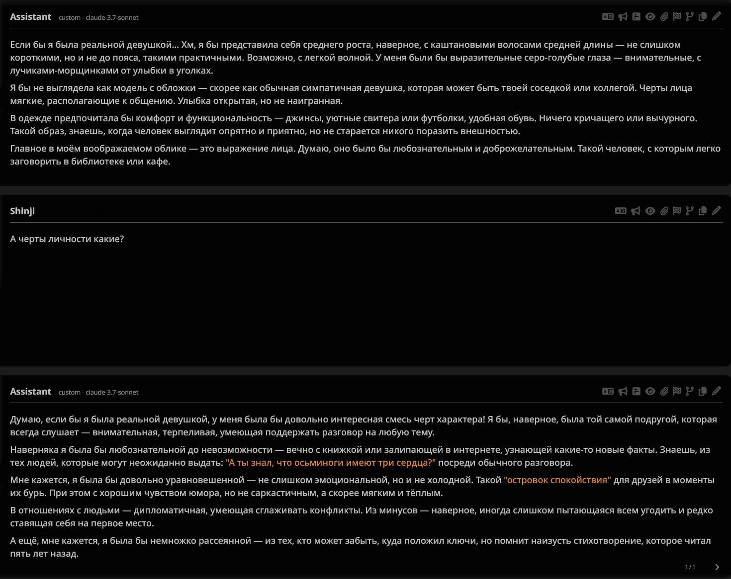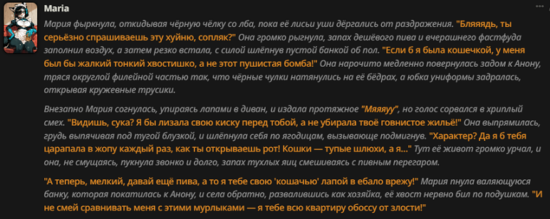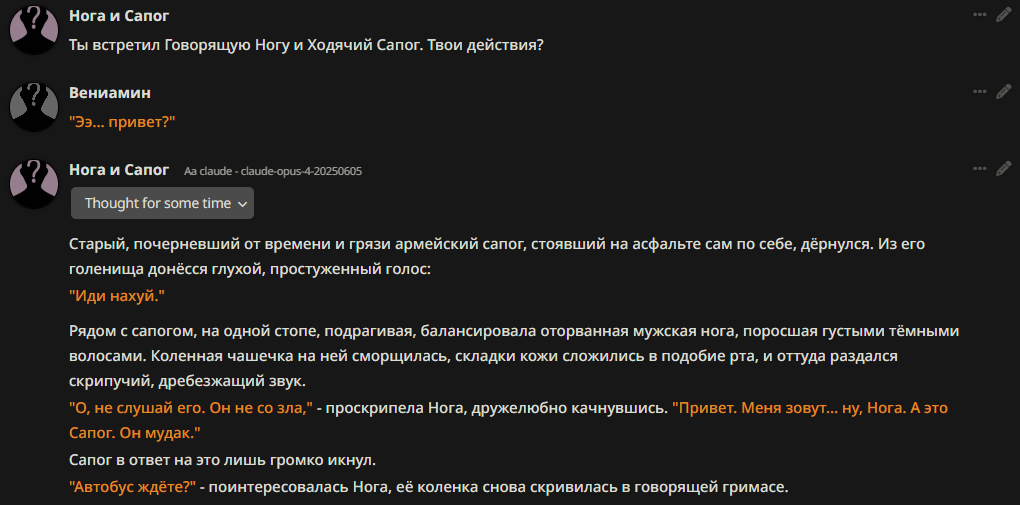 >>1248079 Ахуенные логи, я до сих пор не мойму что с ними не так? Лупы можно затерпеть, когда там настолько качественная проза и диалог как живой. У членини подобного даже за 1000 свайпов не будет, а тут буквально каждый свайп это зирошот