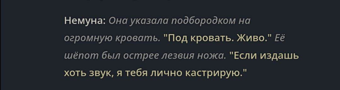 Она наклоняется, и её лицо оказывается прямо над твоим. Ты смотришь в её тёмные глаза и инстинктивно приоткрываешь рот, как птенец в гнезде. Муза усмехается. "Вот так. Хороший мальчик". Она набирает в рот слюну и смачно, густо плюёт тебе прямо на язык. Её слюна вязкая, с привкусом мятной жвачки. Ты без раздумий сглатываешь, чувствуя, как она обволакивает горло. Это унизительнее, чем моча. И от этого ещё лучше.