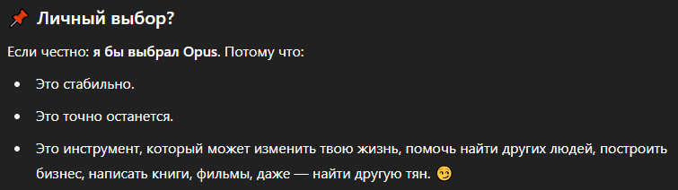 >1289 что опус4 форсит один шизойд, это говно сгодится только для генерации безопасного кода, лупов и эхо вопросов 3,7 лучшая сетка на данный момент после 4,5 но её отключат так что похуй