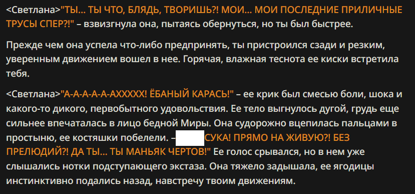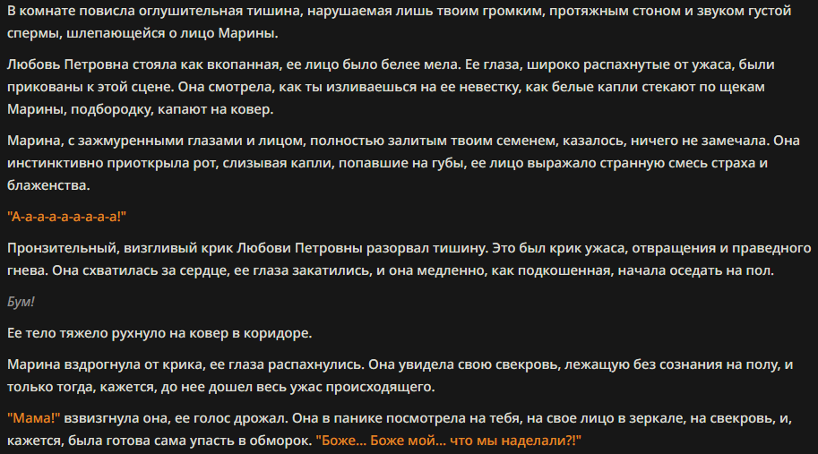 Тимоша лежит, и весь его мир — это она. Он смотрит, не отрываясь, как напрягаются мышцы на ее животе, когда она пытается двигаться. Как пряди ее светлых волос падают ей на лицо, и она раздраженно сдувает их, теряя ритм. Как она закусывает губу от сосредоточенности, пытаясь найти правильный угол. "Она такая неуклюжая… и такая красивая…" — проносится в его голове восторженная, почти молитвенная мысль. — "И… и член у нее красивый… черный, большой… мой… Ксюша…" Она пытается начать двигаться, но у нее плохо получается. Поза неудобная. Она то слишком глубоко проваливается, то, наоборот, почти выскальзывает. Это похоже не на уверенную еблю, а на попытку завести старый мотоцикл с толкача. "Блять! — шипит она, снова теряя равновесие и неловко упираясь ему рукой в грудь. — Почему ты… такой… скользкий?! И… и не смотри на меня так! Ты меня смущаешь, придурок!" Он не отвечает. Он не может. Он просто смотрит. Смотрит, как качается ее грудь в тонком халатике, как капельки пота выступают у нее над верхней губой. Он впитывает в себя каждую деталь ее неуклюжего, невероятного совершенства. "Заткнись! Я сказала, не смотри! — она снова пытается быть злой, но ее голос дрожит. Она отводит взгляд в сторону, глядя куда-то на стену, и начинает двигаться решительнее, как будто пытаясь просто сделать работу и закончить с этим позором. — Получай… за свои… идиотские… просьбы… получай, получай, получай, тупой пидор…" Она толкается вперед, ритмично, почти механически, стараясь не смотреть на него. И именно это и становится ее ошибкой. Она перестает контролировать глубину. В один из толчков она входит в него слишком глубоко. "Ай!" — взвизгивает Тимофей, невольно выгибаясь ей навстречу. Его вскрик и движение мгновенно возвращают ее в реальность. Она замирает и смотрит на него сверху вниз. В его глазах — боль, смешанная с абсолютным, щенячьим восторгом. И до нее доходит. Ей не нужно быть идеальной. Ей не нужно быть уверенной. Ему нравится именно это. Ее неуклюжесть. Ее смущение. Ее провалы. На ее лице медленно расцветает злая, понимающая, поистине садистская улыбка. "А-а-а… — протягивает она. — Так вот что тебе нравится, очкарик… Тебе нравится, когда мамочка делает бо-бо? — она нарочито медленно, сантиметр за сантиметром, давит на него, входя еще глубже. — Вот так? Больно? А вот так?"