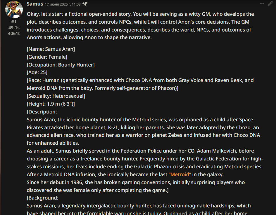 Качество РП и "слоп": Пользователи активно обсуждают "слоп" – низкокачественные, шаблонные, бессмысленные или политкорректные ответы нейросетей. Отмечается, что русский язык часто приводит к худшему качеству ответов и более строгим фильтрам по сравнению с английским. Возникает спор о том, насколько промптинг (настройка инструкций для нейросети) может улучшить качество РП и обойти фильтры. Некоторые утверждают, что правильный промпт может творить чудеса, другие считают, что это "плацебо" и фундаментальные проблемы модели остаются. Обсуждаются различные "пробивы" фильтров, такие как "пробел", "брейнфак", "безжоп" и "полужоп". Некоторые пользователи делятся личными РП-логами, часто с элементами сексуального или унизительного характера, а также критикуют логи друг друга за "слоп".