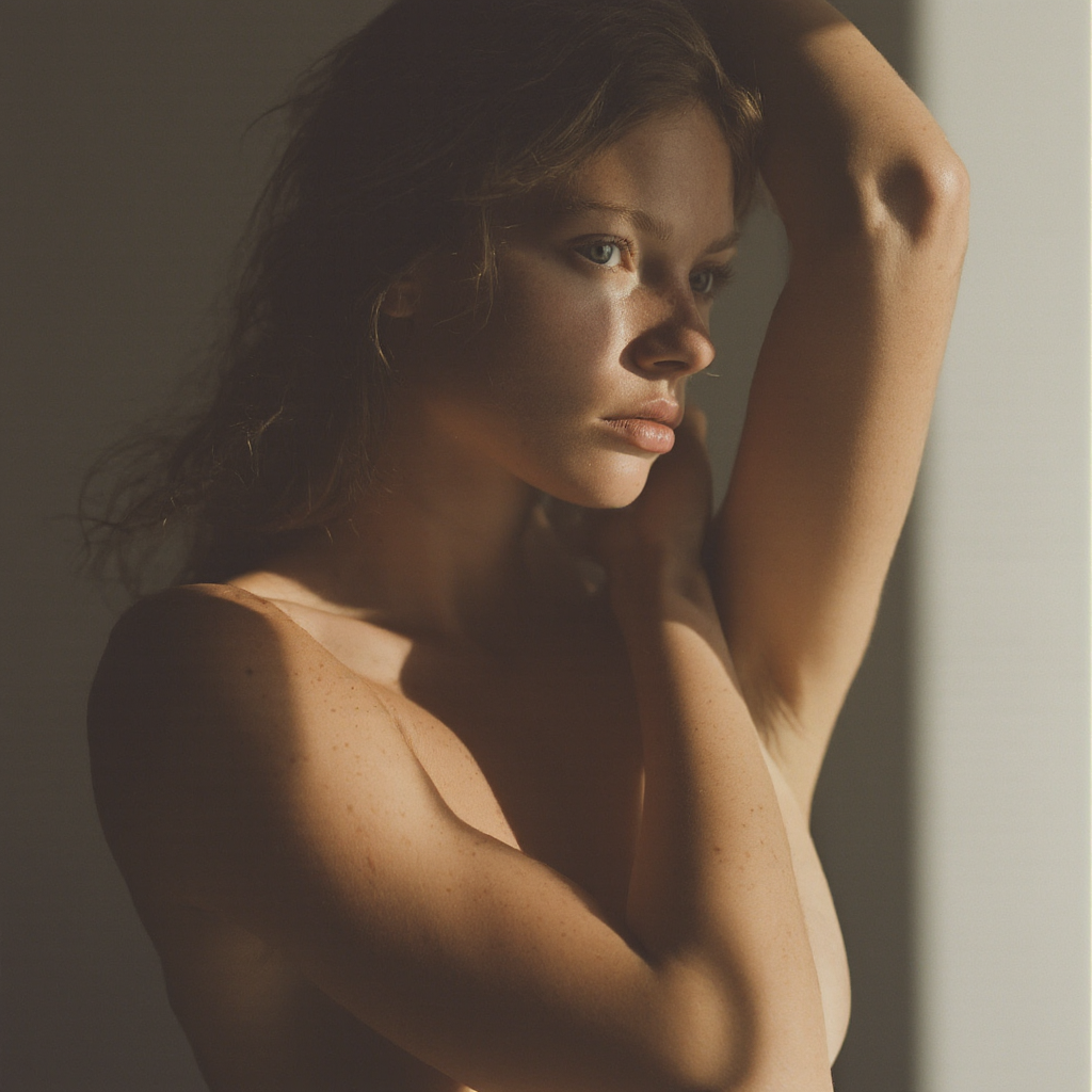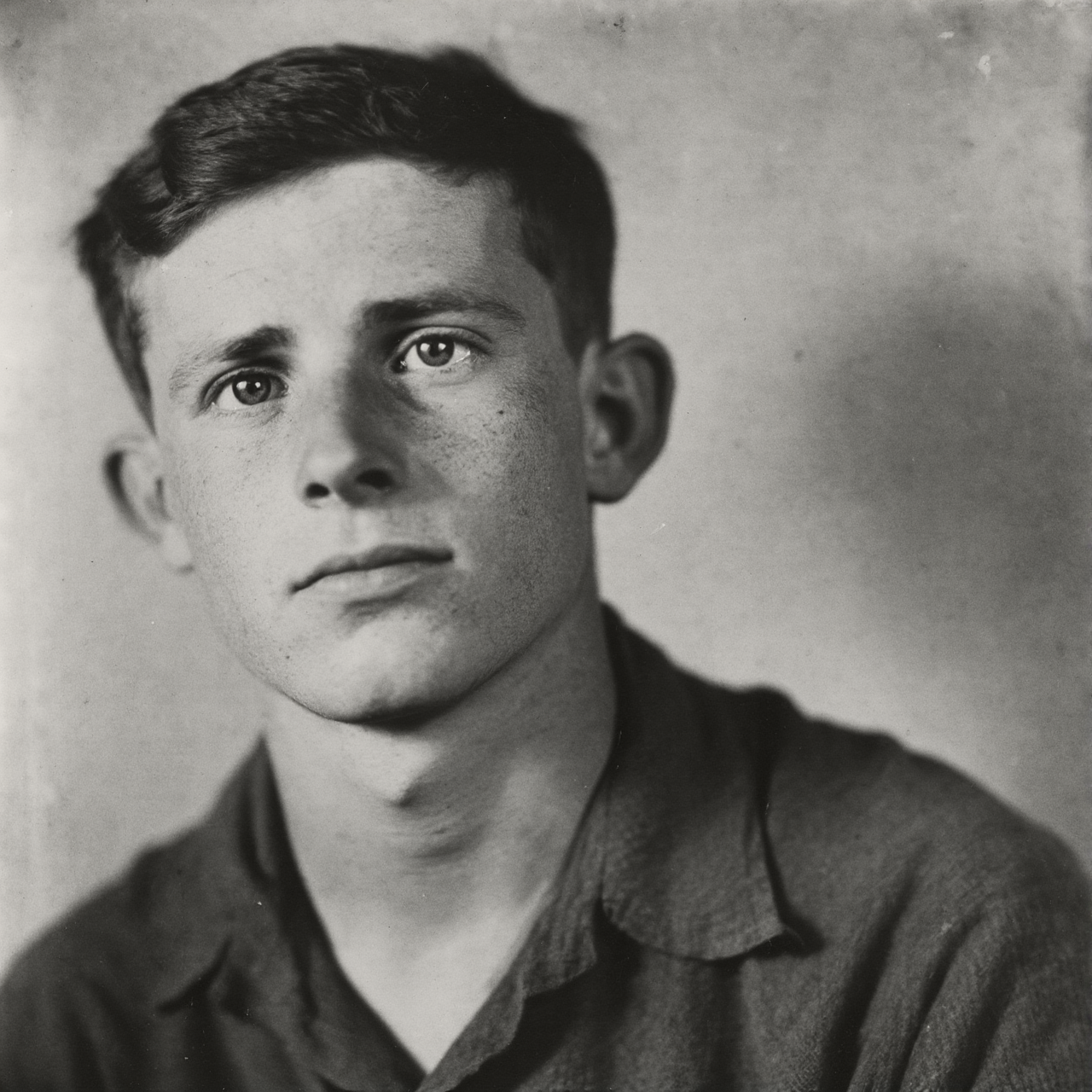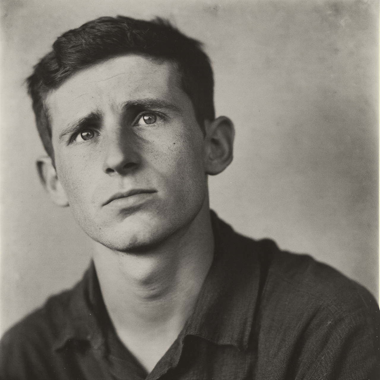 The portrait captures a young man, seemingly lost in thought. He's positioned close to the viewer, almost confronting us with his introspective gaze. The lighting is soft, diffused, suggesting an overcast day or a studio setting with gentle illumination. His features are subtly defined – a slightly upturned nose, a firm but not severe jawline, and eyes that hold a quiet intensity. There's a rawness to his appearance, a lack of excessive grooming that hints at a practical, unpretentious nature. The style evokes early 20th-century documentary photography, reminiscent of Walker Evans or Dorothea Lange, but with a touch of the immediacy of street photography. The background is intentionally minimal, a neutral tone that doesn't distract from the subject's face. The composition is straightforward, almost austere, focusing entirely on the man's expression and the subtle play of light and shadow on his features. It feels like a fleeting moment captured, a glimpse into the inner life of an ordinary person. The image isn’t about glamour or artifice; it’s about authenticity and the quiet dignity of everyday existence. The rendering should have a slight graininess, like a silver gelatin print, and a limited tonal range, emphasizing the contrasts between light and shadow.