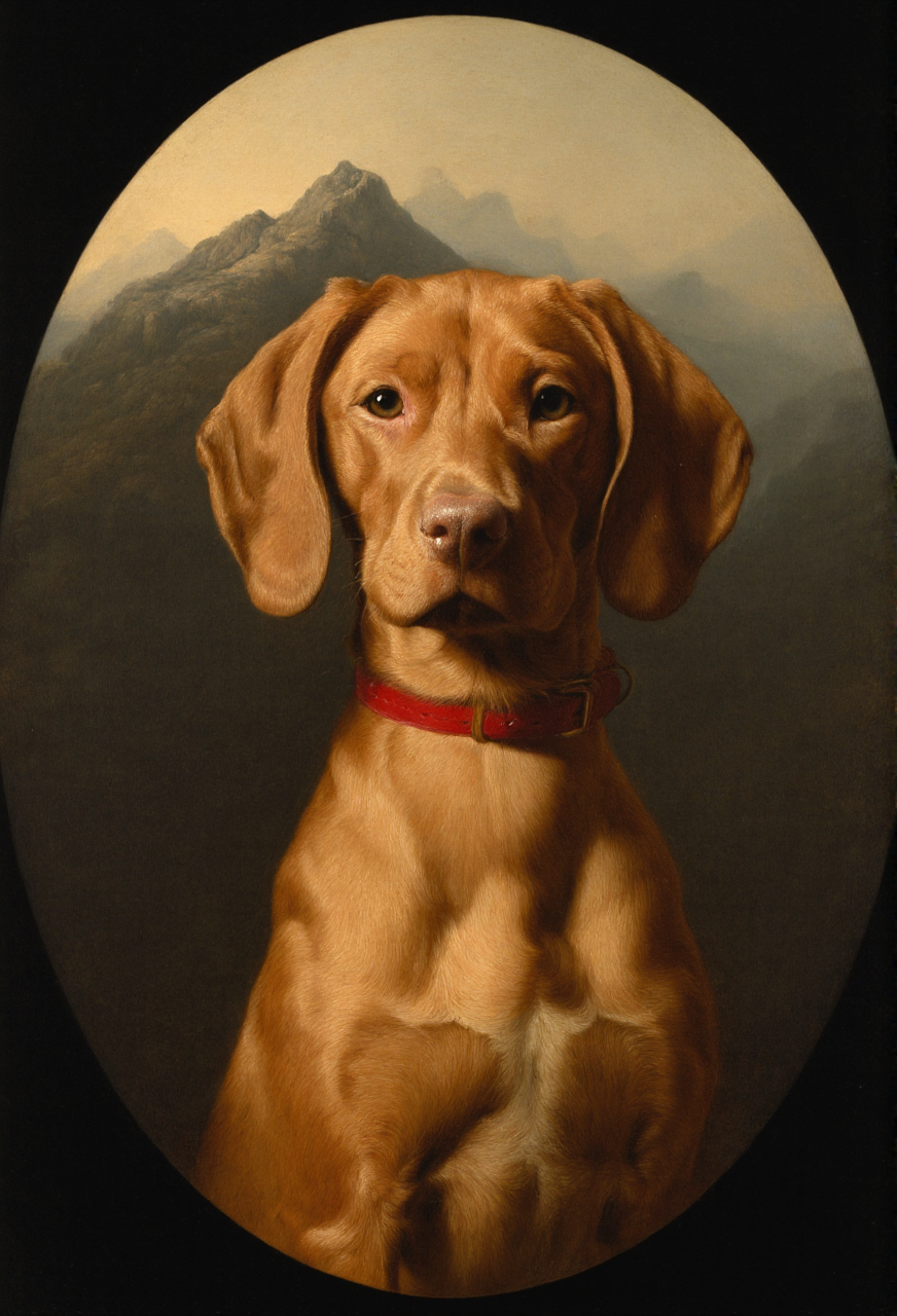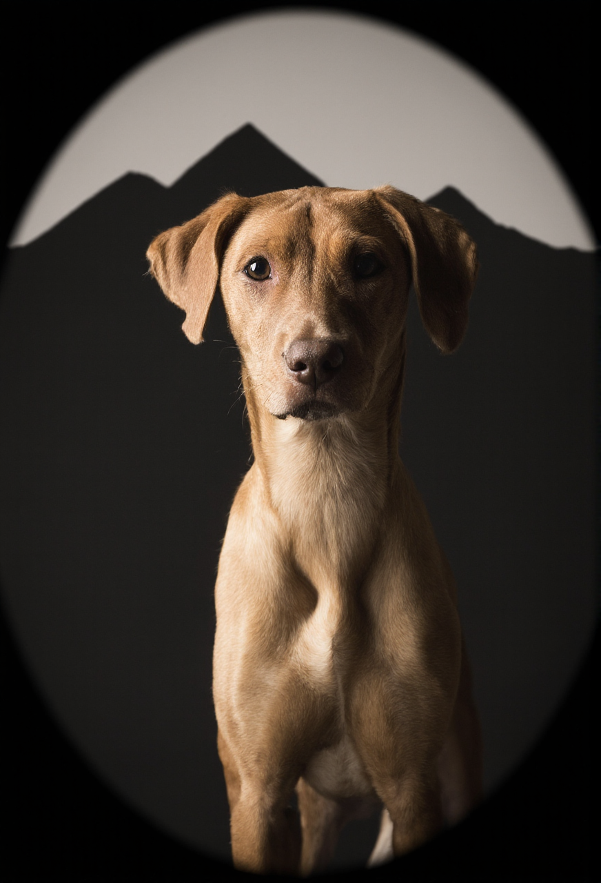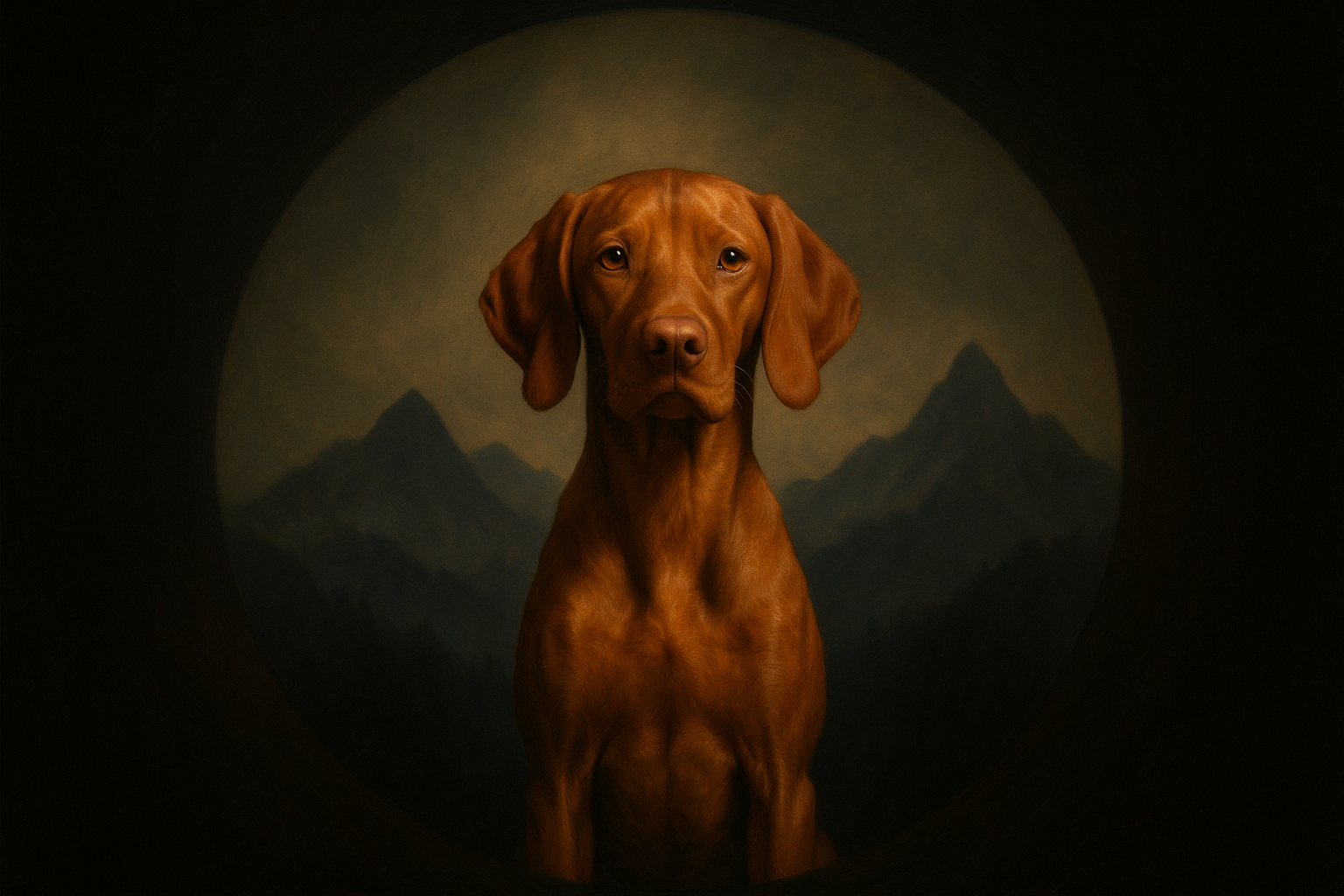 A young Vizsla stands as the focal point of a dramatically lit portrait. The dog's direct gaze and dignified posture convey a sense of quiet contemplation. A stylized mountain range forms a blurred backdrop, enhancing the sense of isolation. The scene is framed by a circular vignette, reminiscent of a theatrical gobo, creating a mood of introspective beauty.