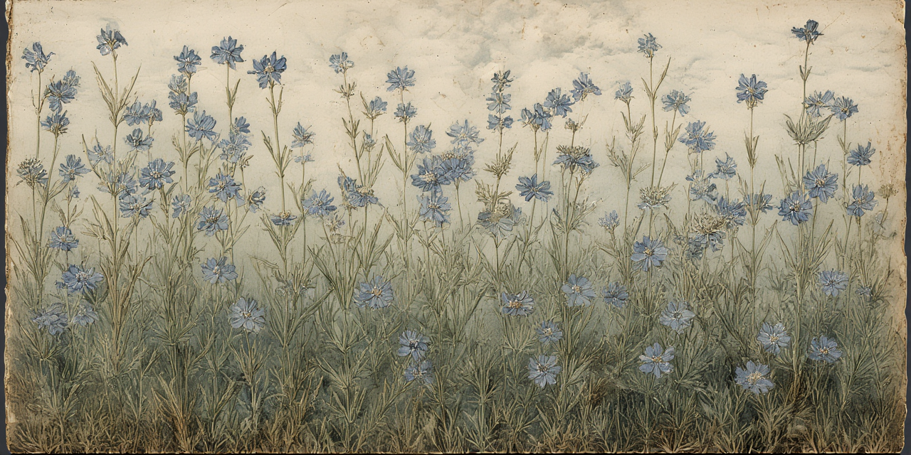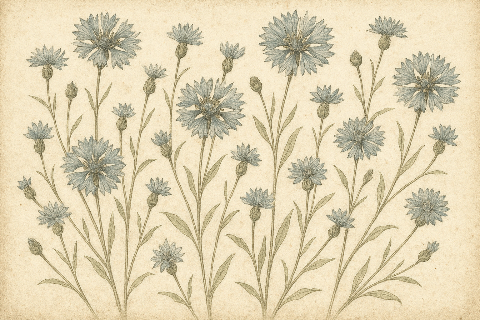 A delicate field of cornflowers unfolds under the soft glow of a diffused, overcast sky. These aren't the vibrant, modern blooms of a summer meadow, but rather faded, almost ethereal representations as if lifted from a well-loved, antique botanical guide. Each petal is rendered with meticulous detail, reminiscent of the engravings found in 19th-century herbariums. The color palette is muted – dusty blues, faded greens, and touches of ochre, evoking the patina of aged paper. The flowers aren’t uniformly perfect; some petals are slightly frayed, others bear the subtle marks of time, adding to their charm. Thin, elegant stems connect the blossoms, interspersed with lanceolate leaves that echo the delicate lines of the floral forms. The composition isn’t a dense, overwhelming field, but a carefully arranged scattering, as if a collector has lovingly pinned specimens to a page. The background is a creamy, off-white, resembling the texture of aged parchment, enhancing the vintage feel. A sense of quiet contemplation pervades the scene, inviting the viewer to appreciate the subtle beauty of these forgotten flowers. The illustration feels less about capturing a fleeting moment of nature and more about preserving a timeless botanical record.