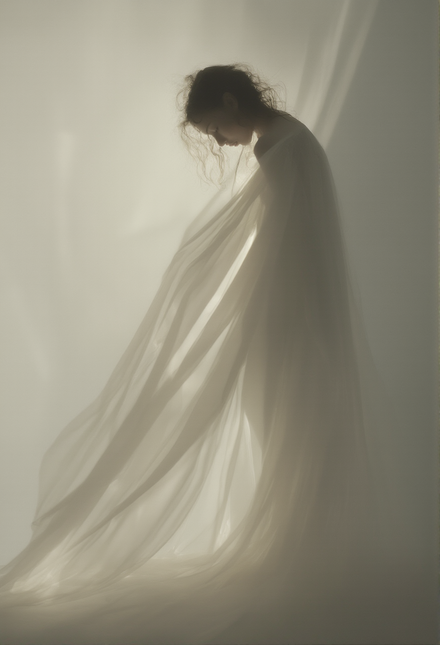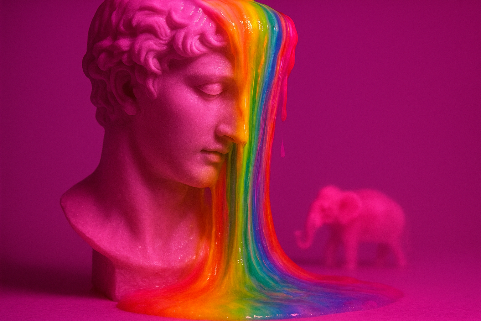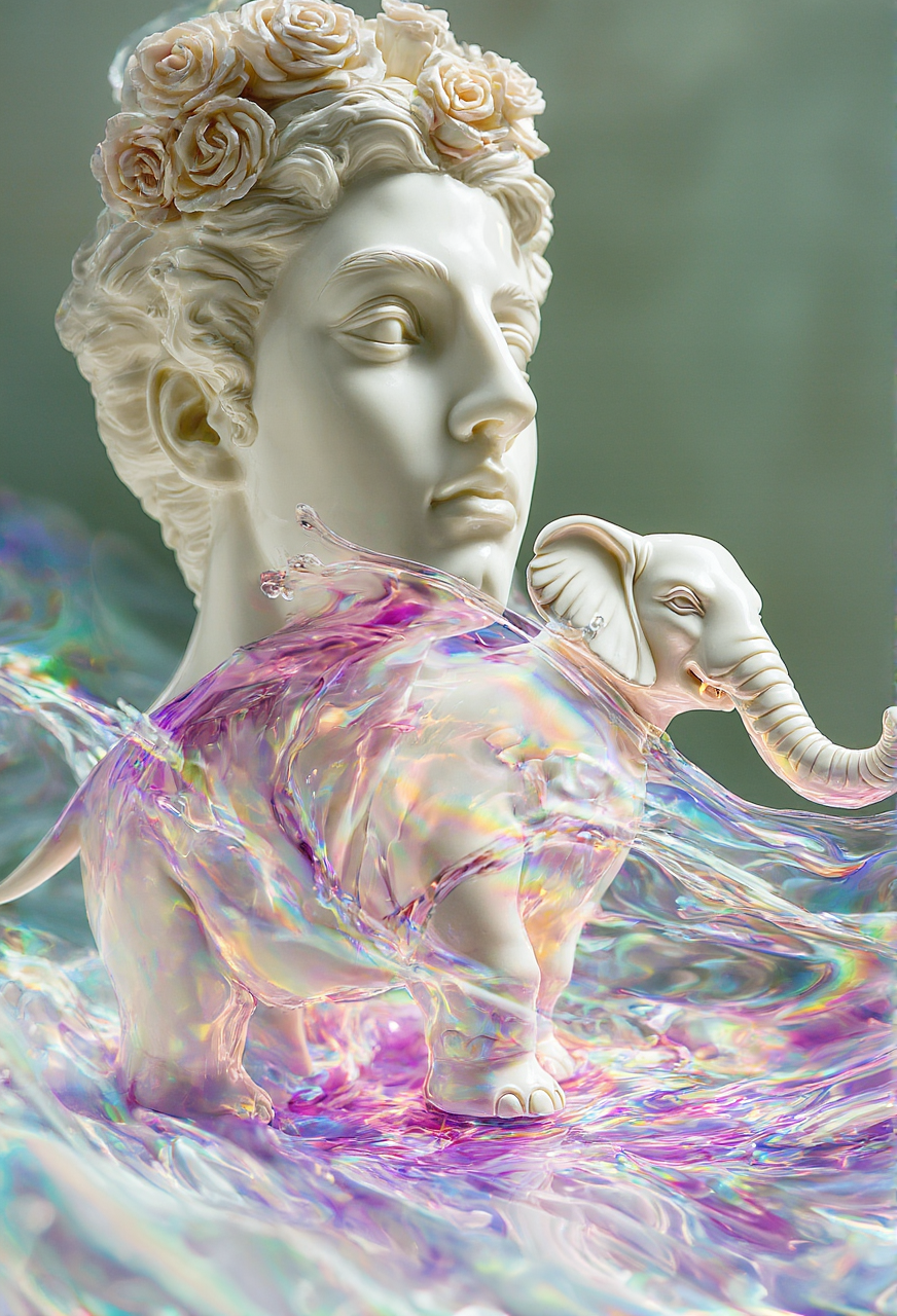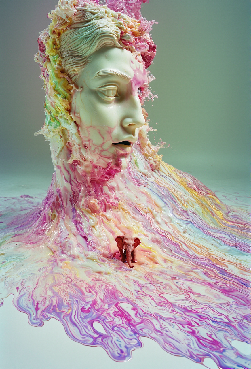 A classically sculpted face dissolves into a cascade of rainbow-colored liquid, creating a dreamlike, melancholic scene. A miniature rose-colored elephant emerges from the flow, blurred and ethereal. The studio is bathed in saturated magenta light, emphasizing the textures and fluidity of the transformation. The composition is tight, focusing on the face and the cascading color, creating intimacy. This image explores themes of change, vulnerability, and the ephemeral nature of identity, captured through light and color.
