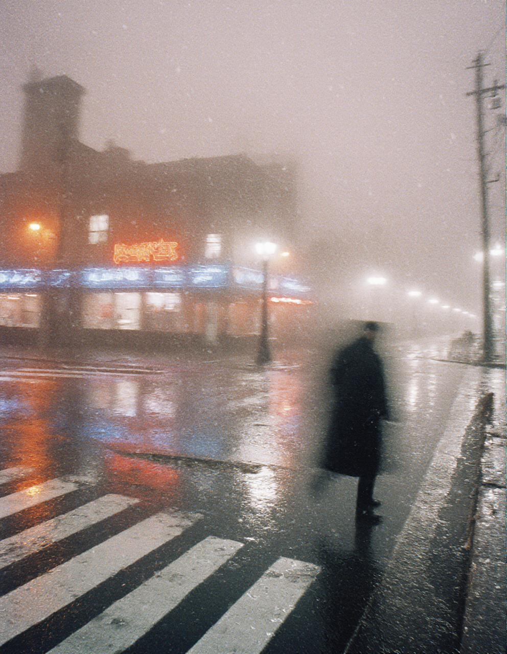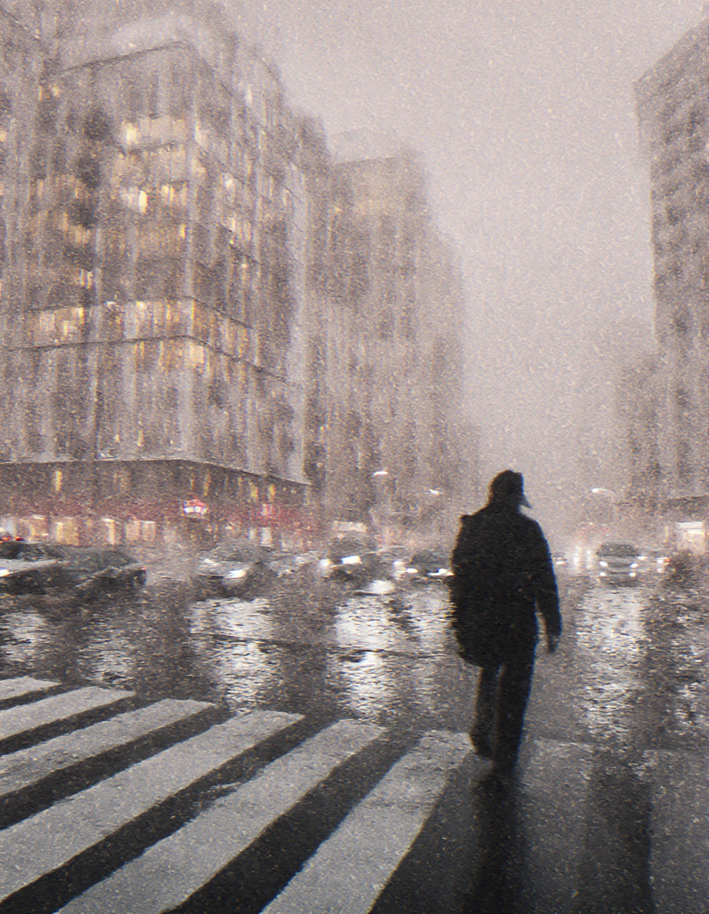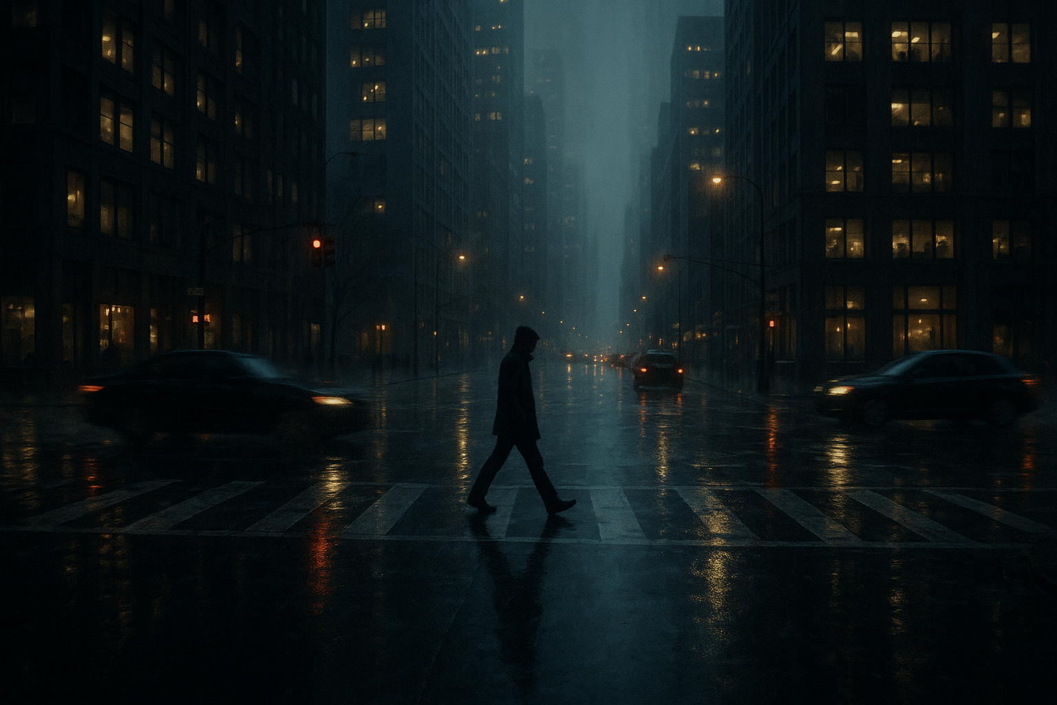 Rain-slicked streets reflect the city's fractured light, creating a somber yet resilient atmosphere. A lone figure walks through the crossing, a silhouette against the blurred motion of cars. Buildings loom like silent guardians, their windows mirroring the city’s energy. The air is thick with the scent of rain and exhaust, a melancholic urban symphony. This scene embodies a quiet defiance, a refusal to surrender to the encroaching darkness and the silence of the city.