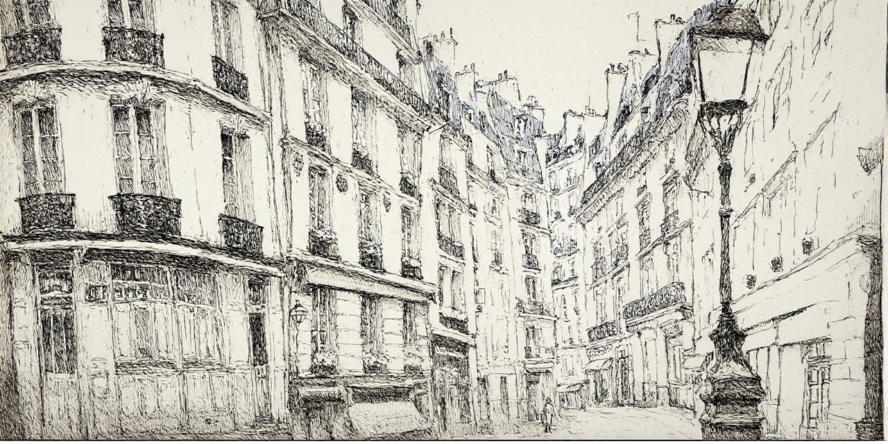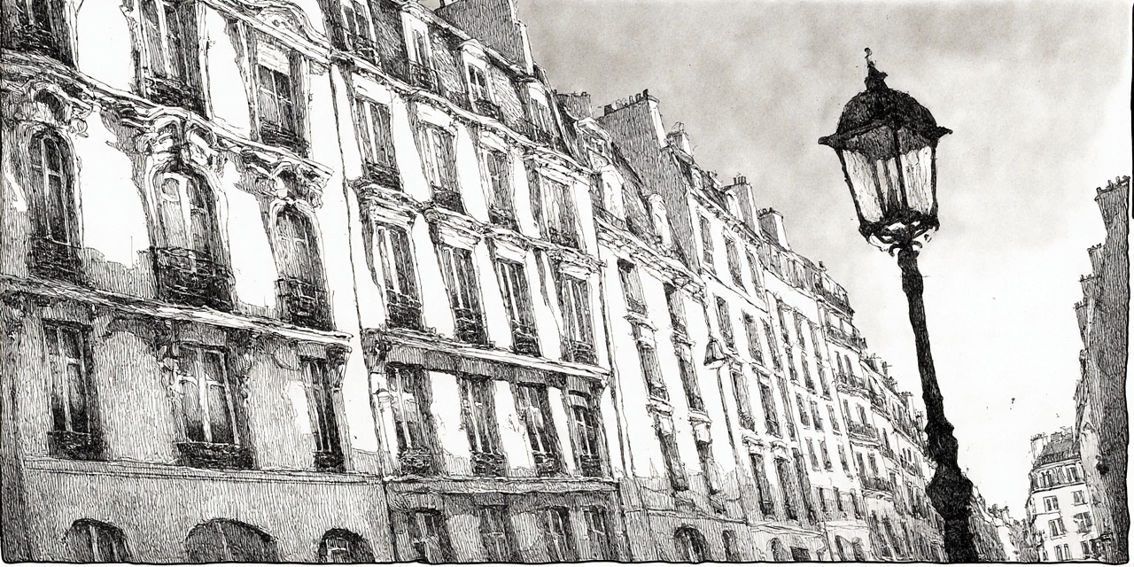 The late afternoon sun casts long, dramatic shadows down a narrow Parisian street, a scene captured not with a camera, but meticulously rendered in ink and wash. The buildings lean inwards, almost conspiratorially, their ornate facades a testament to a bygone era. Each window is a dark, mysterious eye, hinting at lives lived within. The street isn't bustling; a quiet melancholy pervades the scene. A single, antique lamppost stands sentinel, its glass faintly glowing. The perspective is slightly skewed, as if viewed from a slightly elevated position, lending a sense of unease and intimacy. The artist's hand is visible in the delicate cross-hatching and the subtle gradations of tone. This isn’t a straightforward depiction of architecture, but an exploration of atmosphere, a mood piece evoking the spirit of a city steeped in history. The ink bleeds slightly into the paper, creating a sense of age and fragility. The buildings themselves are not perfect, there are subtle imperfections, cracks in the plaster, a sense of weathering that adds to the authenticity of the scene. It feels less like a photograph and more like a memory, a dream captured in monochrome. The composition is carefully balanced, drawing the eye down the street, past the leaning buildings, towards a distant, undefined horizon. The light is not harsh, but soft and diffused, creating a sense of warmth and intimacy. The scene evokes a feeling of nostalgia, a longing for a simpler time. It’s a place where stories unfold, where secrets are whispered, and where the past comes alive.