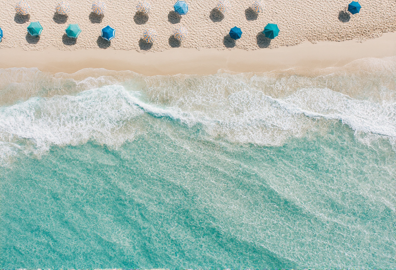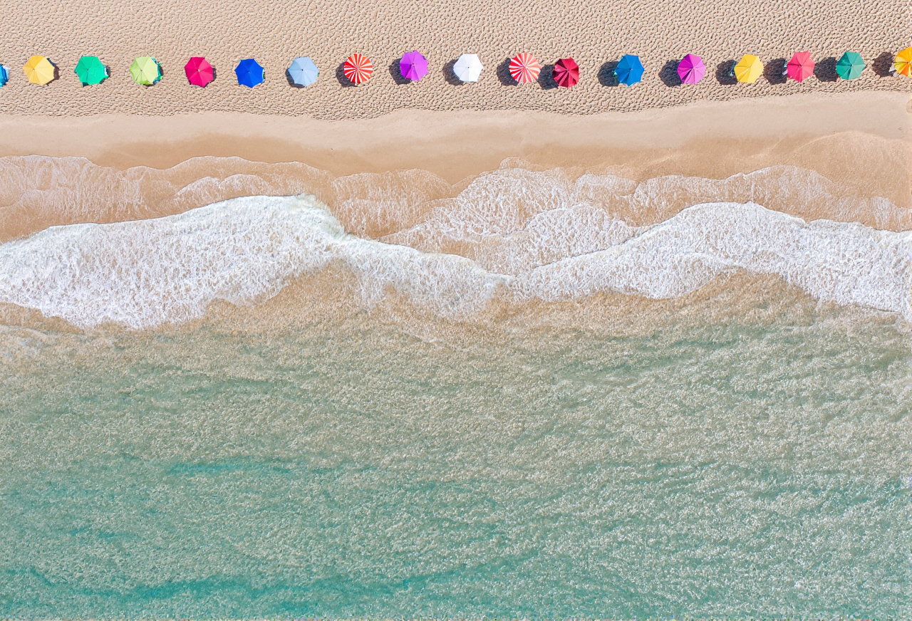 A line of colorful beach umbrellas dots the sandy shore, kissed by gentle waves. The aerial perspective captures the scene's peaceful solitude and the play of light on sand and sea. It's a fleeting moment of seaside leisure, a vibrant contrast of color and texture.