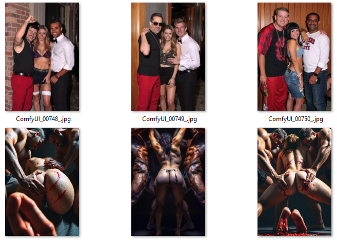 Короткий промпт шнель вообще побоку. Просто стоят трое людей. Длинный же такую сочность дает, что я наверное только превьюшки покажу. Мой вывод: длинный промпт точнее. 1 Two guys ripped a woman's cunt and her ass to shreds 2 Highly detailed, photorealistic digital artwork of two muscular men violently ripping apart a woman's genitalia and buttocks with extreme force and aggression. The scene is illuminated by harsh, dramatic lighting that casts intense shadows and highlights the brutality of the act. The woman's pale, fair-skinned body contrasts starkly with the tanned, muscular physiques of the men. Both men have short, dark brown hair and are completely nude, their lower torsos and genitals partially visible due to their aggressive poses. The woman's legs are spread wide and her head is out of frame, emphasizing the vulnerability and helplessness of her position. Her skin shows deep lacerations, bleeding wounds, and torn tissue where her genitals and buttocks were brutally ripped apart. The men's skin has a sheen of sweat and strain, indicating their exertion. The camera perspective is low-angle, enhancing the dominance and power of the men over the woman. The background is minimal, focusing attention entirely on the violent interaction. The colors include dark reds and browns of the wounds, against the men's tanned skin. Rendering details include high-resolution, 8K quality, with meticulous texturing of skin, muscle fibers, and blood. The overall mood is intense, graphic, and unflinchingly realistic.