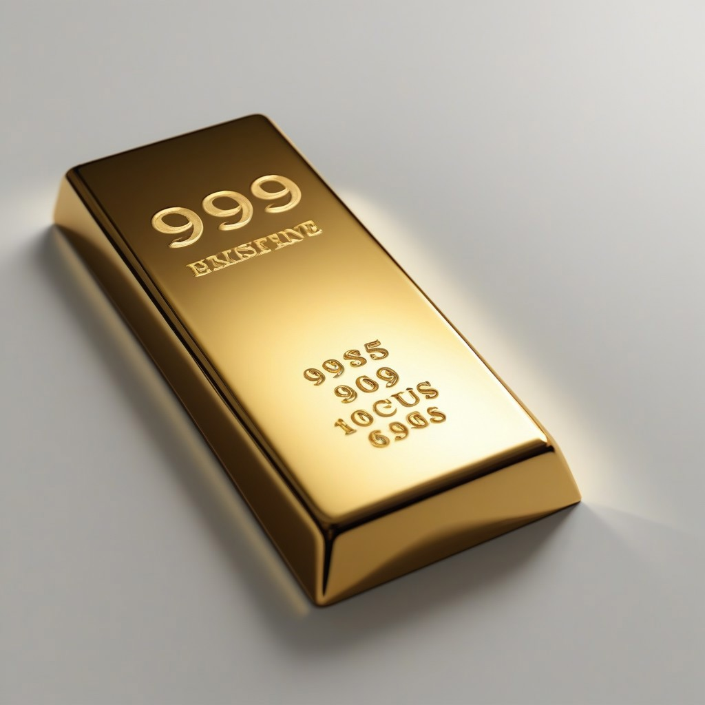 >>1243128 Photorealistic image of a gold bar. The rectangular bar has a smooth, shiny surface with engraved text on the top face reading "999.9 Fine Gold" in raised letters. The bar is slightly tilted to the right, casting soft shadows that enhance its three-dimensional form. The background is plain white, ensuring full focus on the gold bar. The gold color is uniform and bright, reflecting light gently. High detail and sharp edges suggest a high-resolution photograph, potentially captured with a macro lens to emphasize the texture and engravings. The overall composition centers the gold bar, using perspective to create depth. Light comes from the upper left, creating subtle highlights and shadows. No other objects or people are present. The image has a clean, minimalist aesthetic, drawing attention solely to the gold bar's intricate details and luxurious appearance. Camera information includes a macro lens with a shallow depth of field. Digital rendering parameters include high fidelity and precision, emphasizing the realism of the metallic surface and engraved text. 8K quality and photorealistic style. White background ensures visual simplicity and clarity. Soft lighting and gentle reflections add a touch of elegance. The gold bar occupies approximately one-third of the frame, centered horizontally and vertically. Soft shadows cast by the engraving text add depth. Overall, the image conveys luxury, purity, and meticulous craftsmanship.