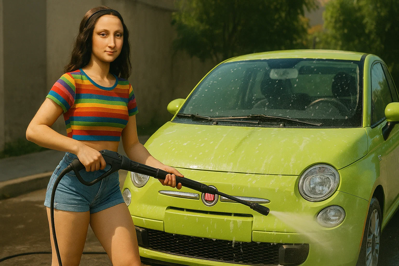 А вот генерить с нуля перечисления или описание - тут сильно от предмета зависит. Портреты, иллюстрации, абстрактные композиции с описанием часто интереснее получается. Простые сцены, предметы и натюрморты как будто становится плоскими, и не то чтобы реалистичными, скорее обыденными, повседневными. Вот как с тачкой. В перечислении динамика движения, в описании просто остановились, вышли, сфоткали.