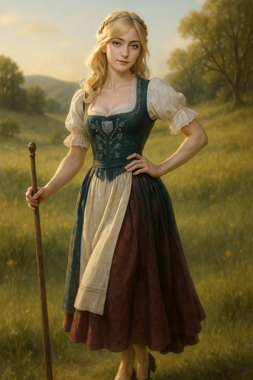 Exaggerated Contrapposto: Weight shifted entirely onto one leg (left), causing a pronounced tilt in the hips. The right leg is bent, toe lightly touching the ground, creating an S-curve in the torso. Shoulders counter-rotated against the hips for maximum dynamism. One arm (left) resting on the hip, the other (right) holding a rustic basket or a scepter-like staff (symbolizing her queenly role). 2. Outfit (German Tracht):