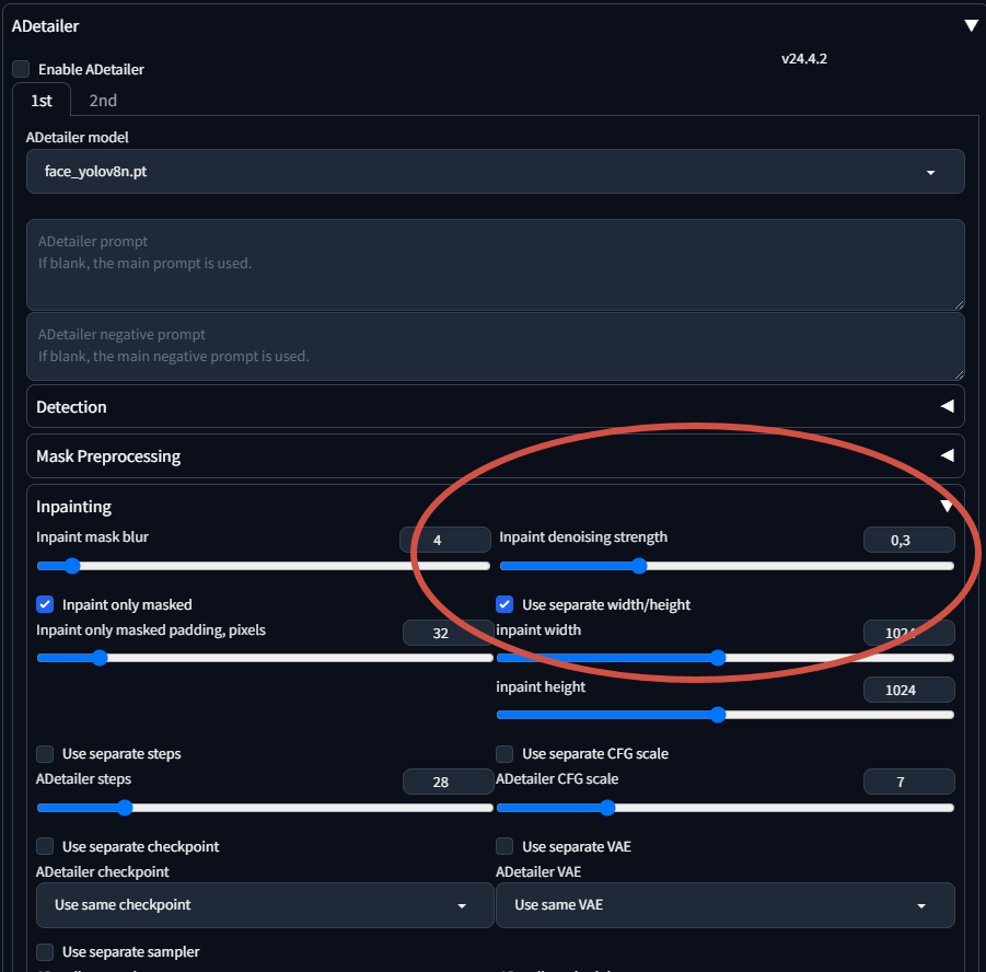 >>1251945 не, модель без всего рисует в форже же видно весь процесс, как adetailer находит лица, обводит служебной рамочкой, потом скейлит ну и в процессе накидывает красивостей, просто он уж слишком много их лепит, поэтому хотелось бы узнать есть ли у него в автоматическом режиме такие опции ну что то типа strenght, сила плагина так сказать чтобы не сидеть в импейнте ну с этим не только я сталкиваюсь, кто то тут помнится писал что его эти 'фотомодельные' лица заебали вконец) вот и меня походу тоже, но без адетейлера совсем уж кривой трэшак, может есть какие то альтернативы я хз
