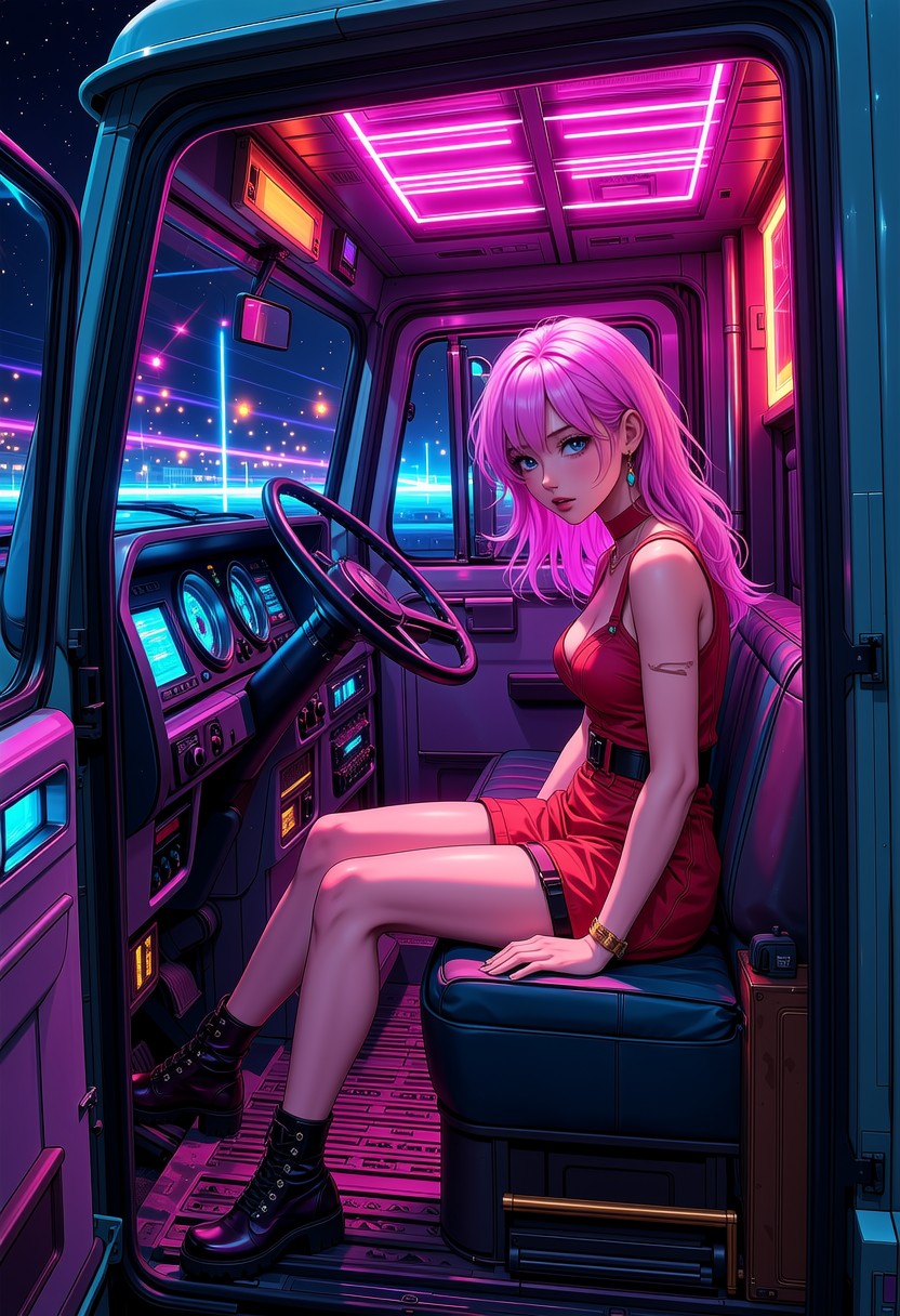 >>1253972 Vintage 90's anime style. cluttered truck interior, fem truck driver, by Hajime Sorayama and Greg Tocchini, Virgil Finlay, sci-fi, colors, neon lights, line art