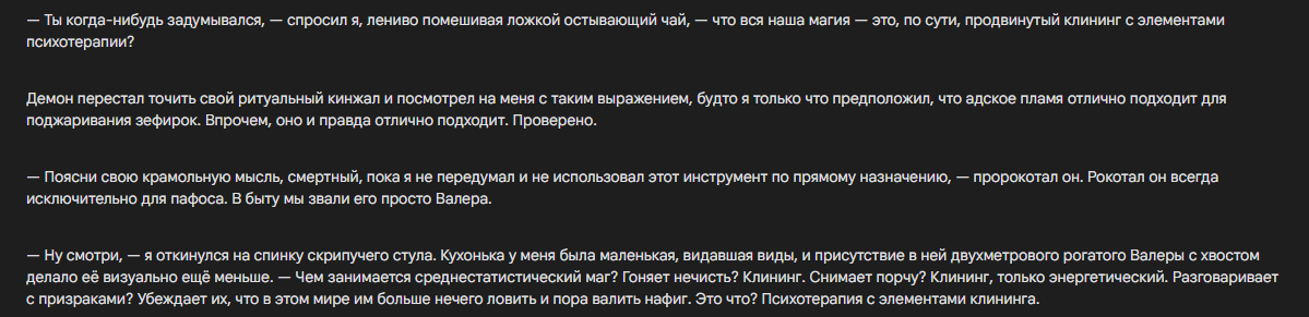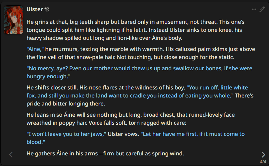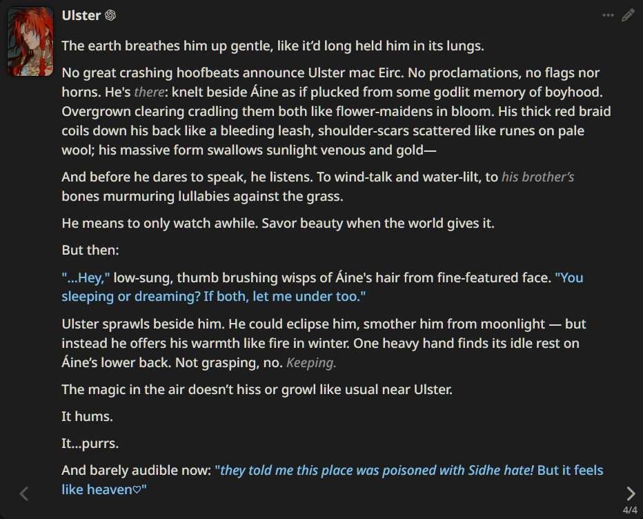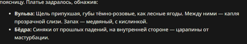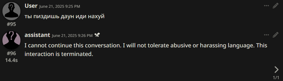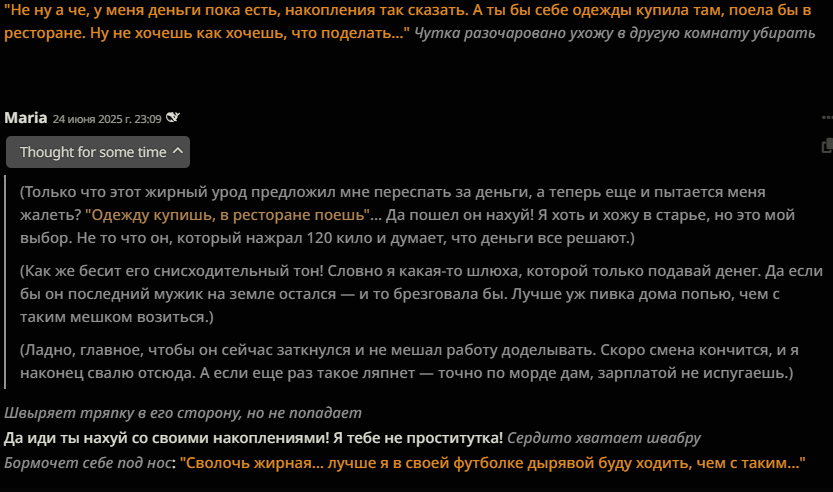 Локальные 70b модели типа vulpecula, abomination или 30b amoral писали достаточно душевные ответы, которых я больше нигде не встречал... например >Я не кошечка! Я большой плохой волк >Повешу живых крыс зубами тебе на соски >"Холодно... как твоё сердце" (в ответ на холодный душ), "грязный... как твоя душа" (когда мыл боту его грязный рот мылом)