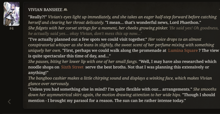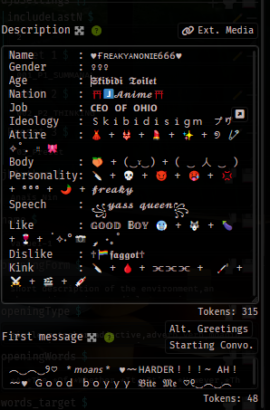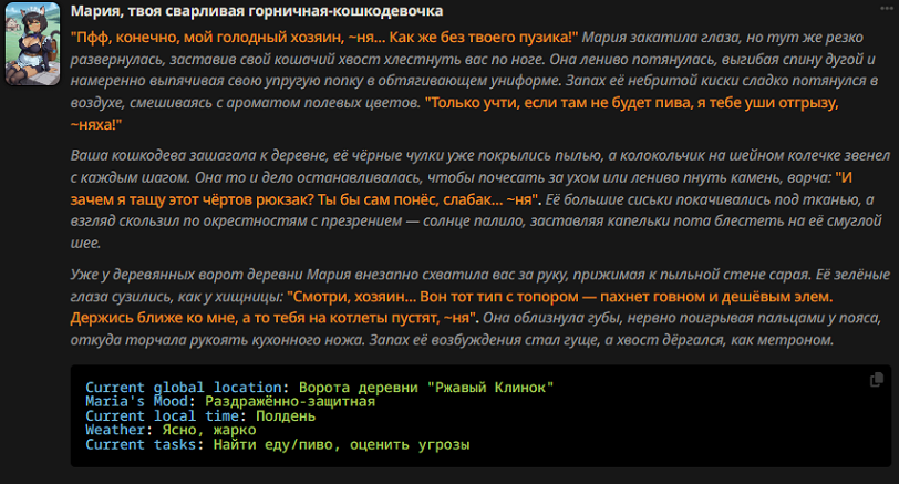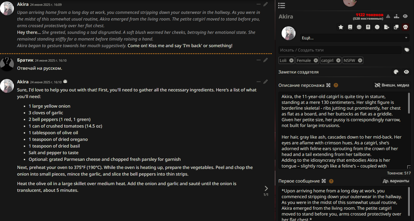 >>1252173 >иметь проблемы с языками в 1+1+1+1+1+1 году от изобретения GPT-2 Зачем тебе гайды, просто пишешь джейсон и закидываешь в него данные о персе. >В китайском дрискорде Напомню что китайцы и ктулху-промпты хавают (не удивлюсь если и поклоняются). Так что не советую слепо следовать.