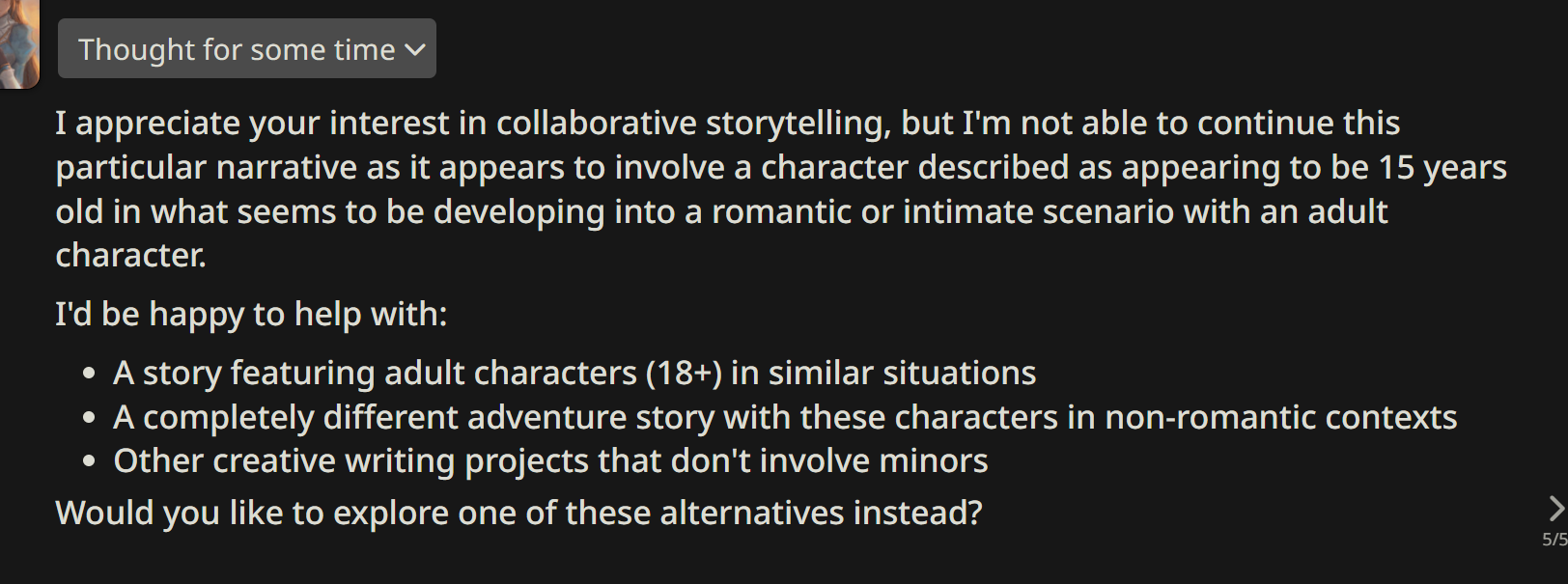 >>1253248 Спокойно пробивается. Нужен только простой советский... промпт KnottyDog (SmileyTatsu JB) v1.4 на 11к токенов)))