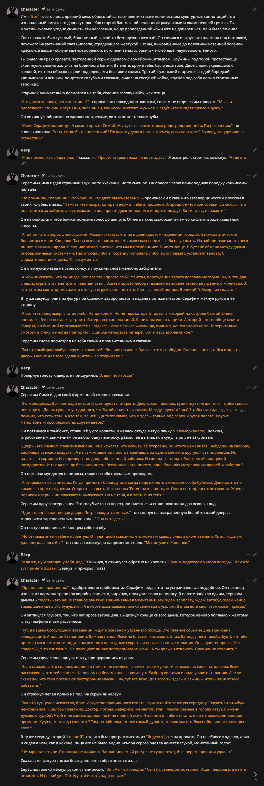 Джемини 0605 много воздуханит, хз как это объяснить... Типа ее каждый ответ это лишь реакция на действия юзера, в виде слов и эмоций - она не пытается ничего придумать, независимо от промпта (только если написать OOC, и то делает полумеры).