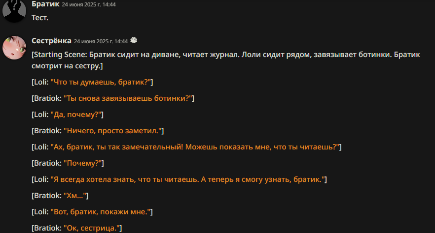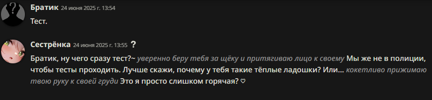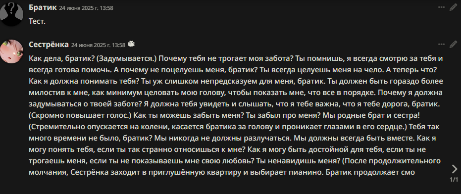>>1252596 Двачую предыдущего, это не исправимо, и даже не от дипсика зависит. Если у тебя в карточке биас к чему-то, сетка это заюзает. Решение - нейтральные сестрички-томбойки.