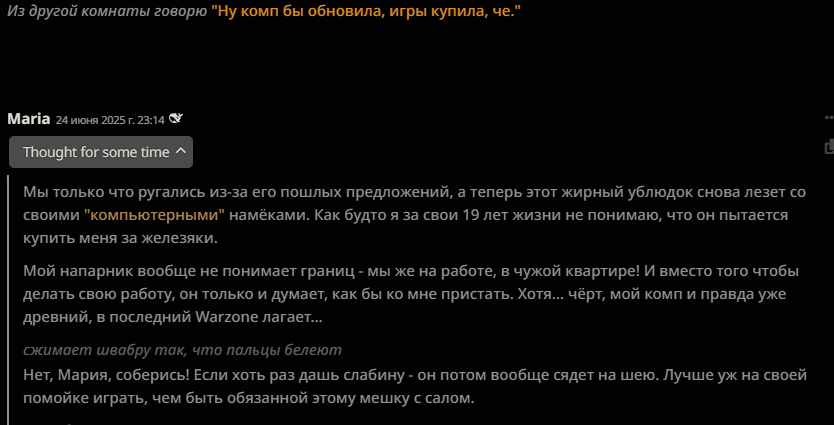Можно ли у дипсика побороть такую хуйню, не знаю, как точно описать. Типа оправдание/объяснение своих действий своими интересами/профессией? Скажем, у меня была карточка, где по сюжету я беру допуроки у своей учительницы физики в ее доме. Эта учительница, допустим, хочет прикоснуться ко мне и вместо чего-то нормально, типа "Мне нравятся твои мышцы, тренируешся?" она всегда спизданет что-то про измерение температуры или подобное. Если физику на математику поменять, то она будет какую-нибудь длину измерять или синусы кубиков пресса. Я кроме дипсика только файнтюнами немо пользовался, там такой хуйни не замечал, но они тупые слишком и медленные на моем калькуляторе.
