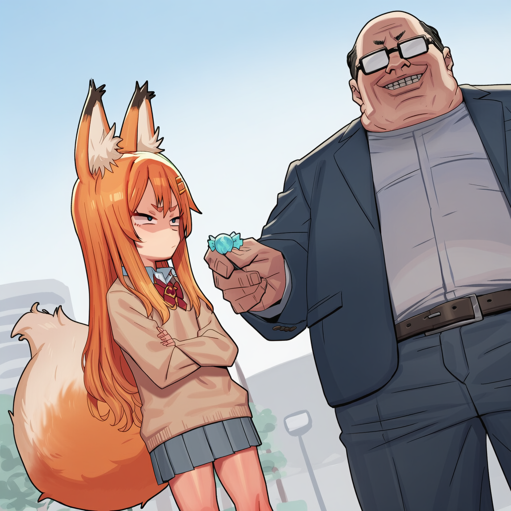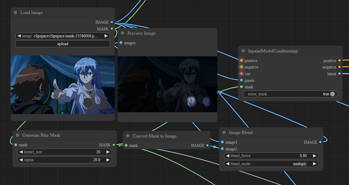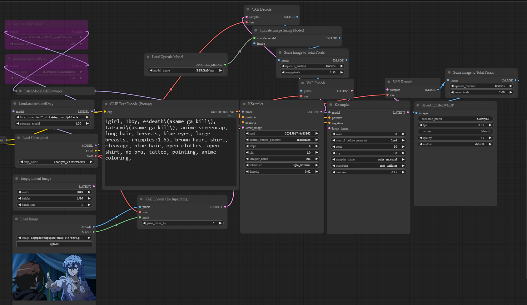 >>1249050 Я сейчас впервые в жизни инпеинтил на сдхл, на авось вместо емпти латент ноду инпейнта кинул. Чекпоинт знает этих персов, далее апскейл х1.5 с 0.15 денойсом. В промпте esdeath\(akame ga kill\), tatsumi\(akame ga kill\), anime screencap и далее теги из вд14