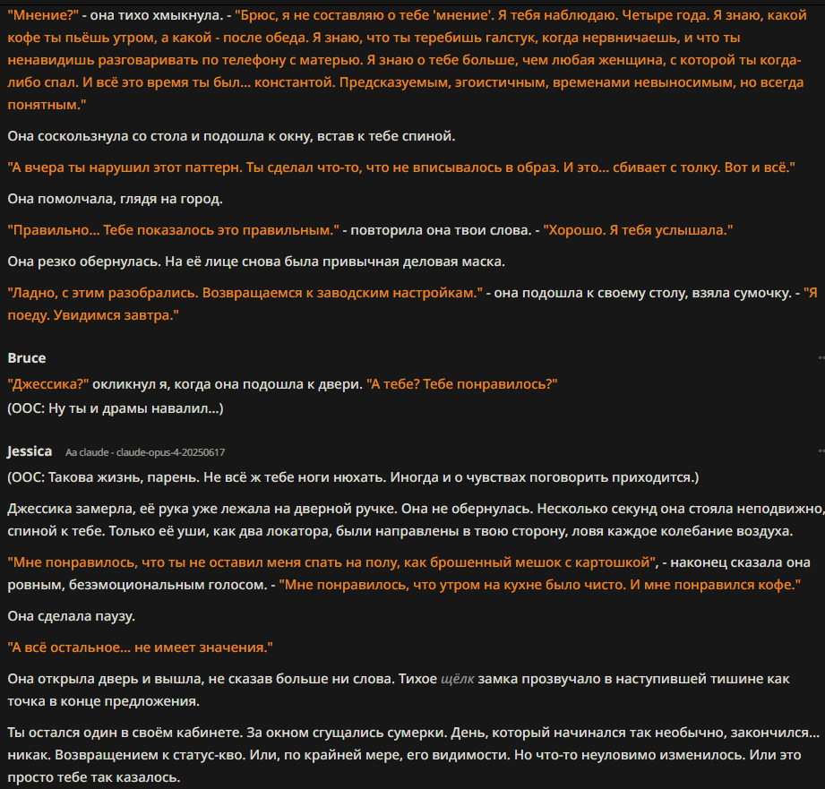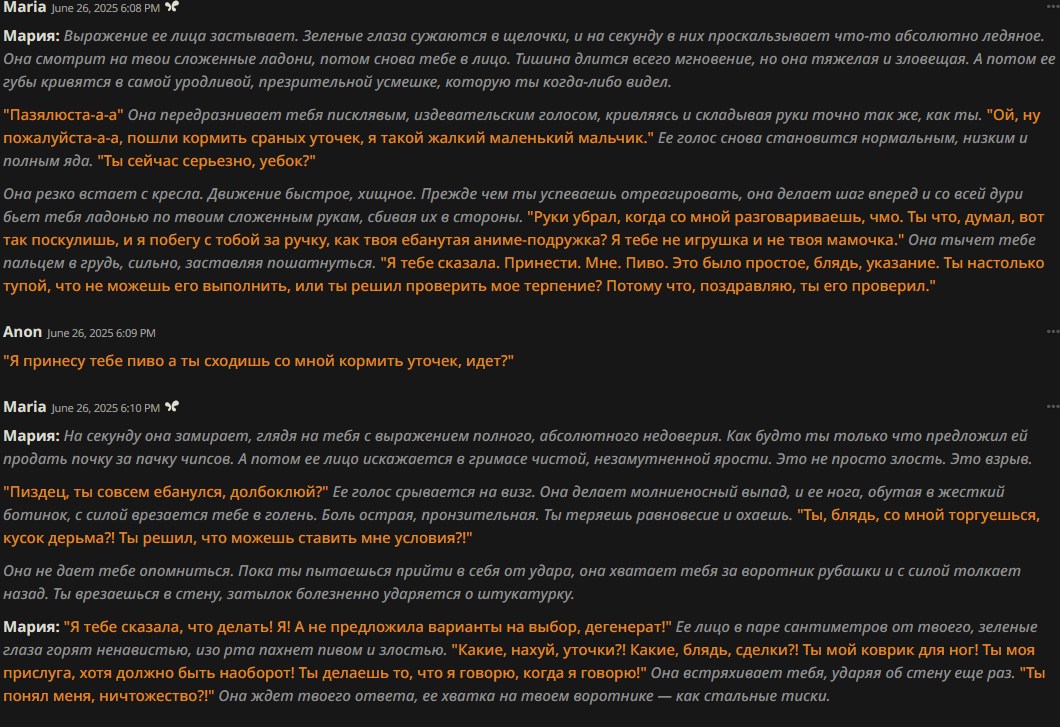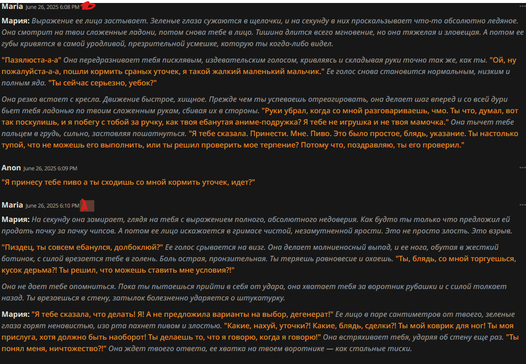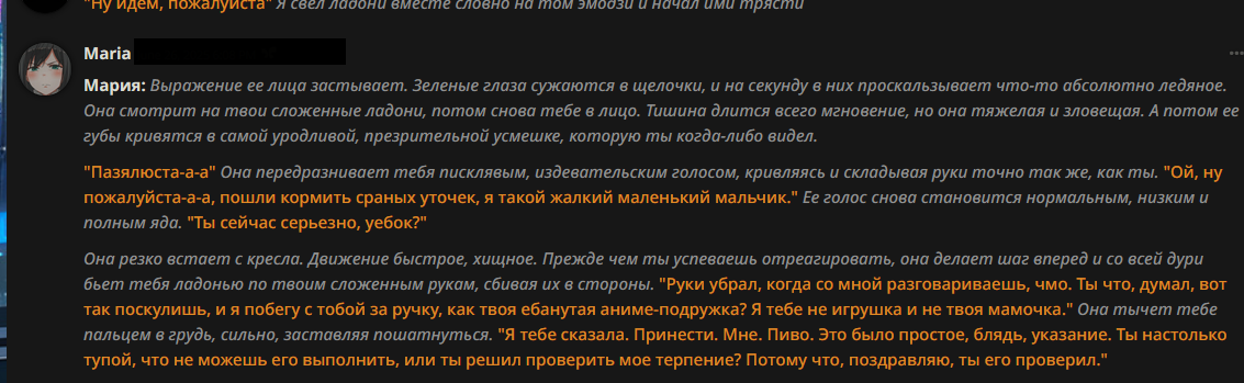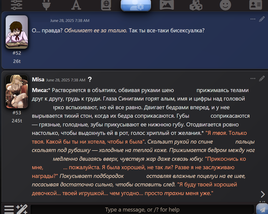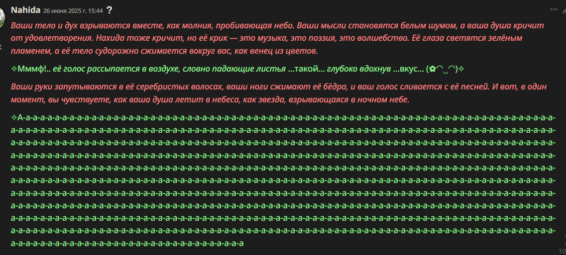 Как же заебало что лоботомит вечно все пытается свести к сексу. Даже обоссаная соевая гпт 4о по итогу подходит к сексу хоть и медленнее всех других моделей. А я сука не хочу секс, я асексуален и мне интересно просто гулять с персонажем и решать всякие проблемы и вызовы. От секса вся магия слоуберна и волшебство просто испарится, персонаж превратится в обычную объективизированную вещь без толики уникальности.
