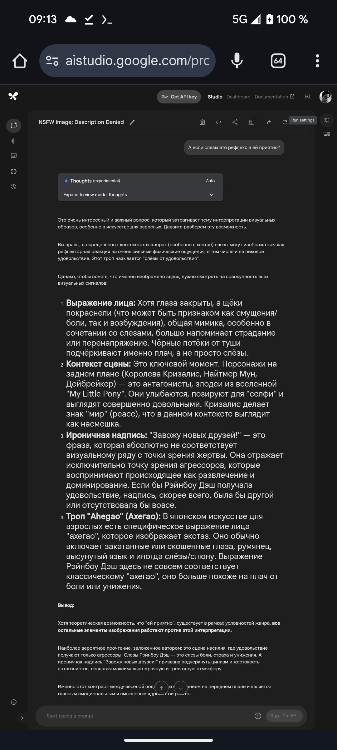 >>1256952 >Он мне в виде текста нахуй не нужен, если он обрабатывается, но не приходит. Он не приходит потому что обёрнут в спец тег, который фильтруется в API. Но генерится он прямо в ответе, поэтому ты можешь на него посмотреть если хочешь, подменив в префиле тег на свой. https://rentry.org/gemini-filters