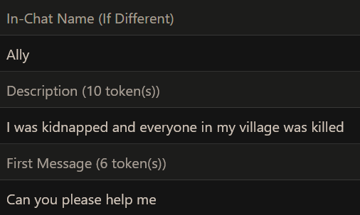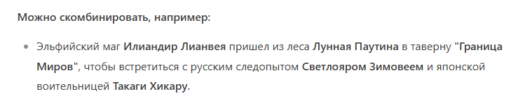 >>1256556 Нет, зачем? Примеры это не дефы, просто туда их стоит засунуть чтобы лобомит понял к кому они относятся. Подумай как у тебя финальный контекст будет сформатирован, например ><чар>такой-то такой-то</чар> ><персона>такая-то такая-то</персона> ><примеры речи>бла-бла</примеры речи> Примеры чьей речи даны выше? Лоботомит по смыслу-то поймёт наверно, но зачем ему лишний раз усложнять работу.
