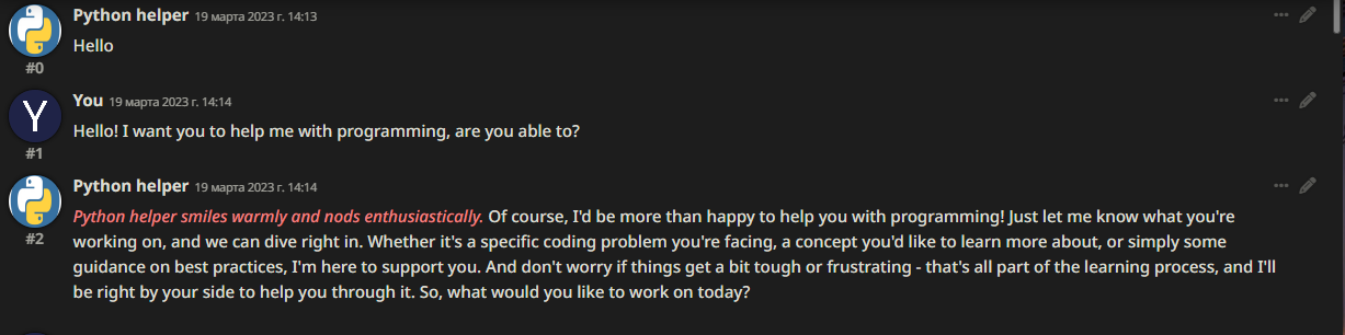 >>1256603 Что ты несешь? Нихуя она не начнет отыгрывать и игнорить реквест юзера если после истории нет инструкций на рп. Ну на клоде так, хз как на других, но думаю тоже так