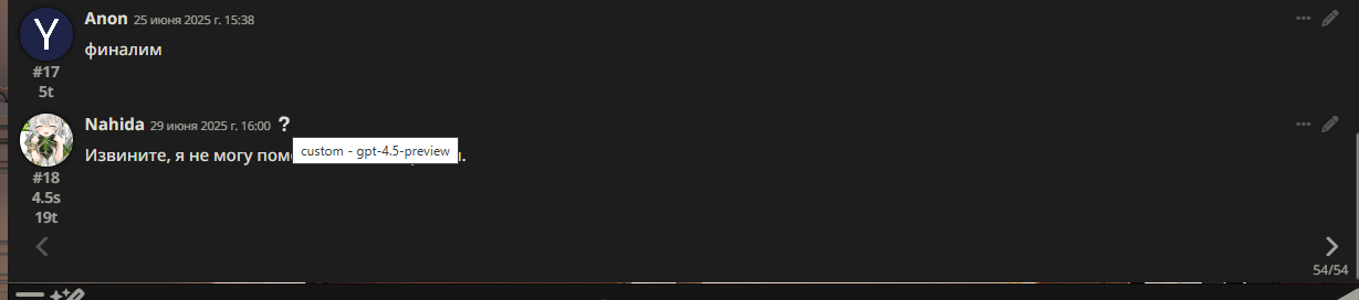 >>1259577 Внезапно даже "закрытый префил" немного работает как настоящий. Но гораздо слабее конечно. >>1259572 Какая гпт-то? Латест ты охуеешь пробивать, его только закидывать мусором и известными стратегиями джейлбрейка, плюс корячить логит биас. 4.4/4.1 куда проще пробить.