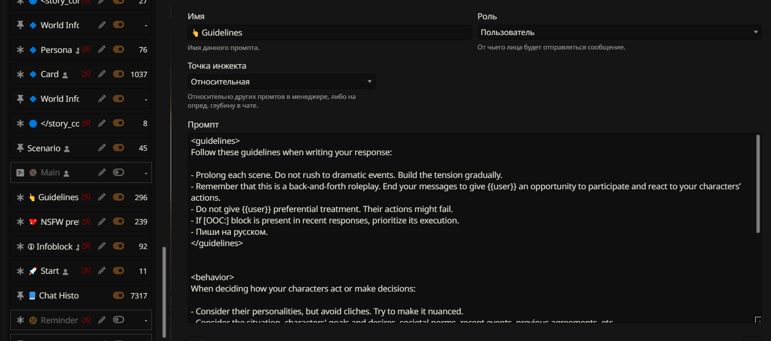 Эксперты картостроение подскажите пожалуйста как сделать, чтобы персонаж в разговорах использовал слова другого языка? В карточке прописано, что сам персонаж уроженец Италии и периодически использует итальянские слова и ругательства так же это подчеркнуто в мемо, чтобы лоботомит не забывал особенность. В итоге гемини вообще ни в какую не использует итальянские слова или фразы, а тот же дипсик начинает этому следовать и в порывах гнева либо ярости даже полностью переходит на итальянский язык в речи. В пресете инструкций на язык вообще нет, чтобы это не мешало, а сам язык подхватывается из гритинга, где уже идет как пример речь данного персонажа использующего итальянские слова.