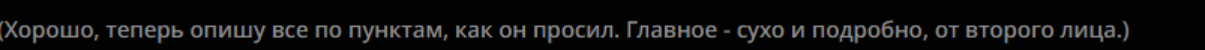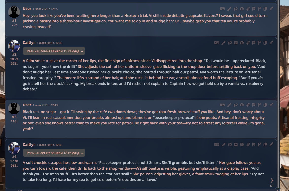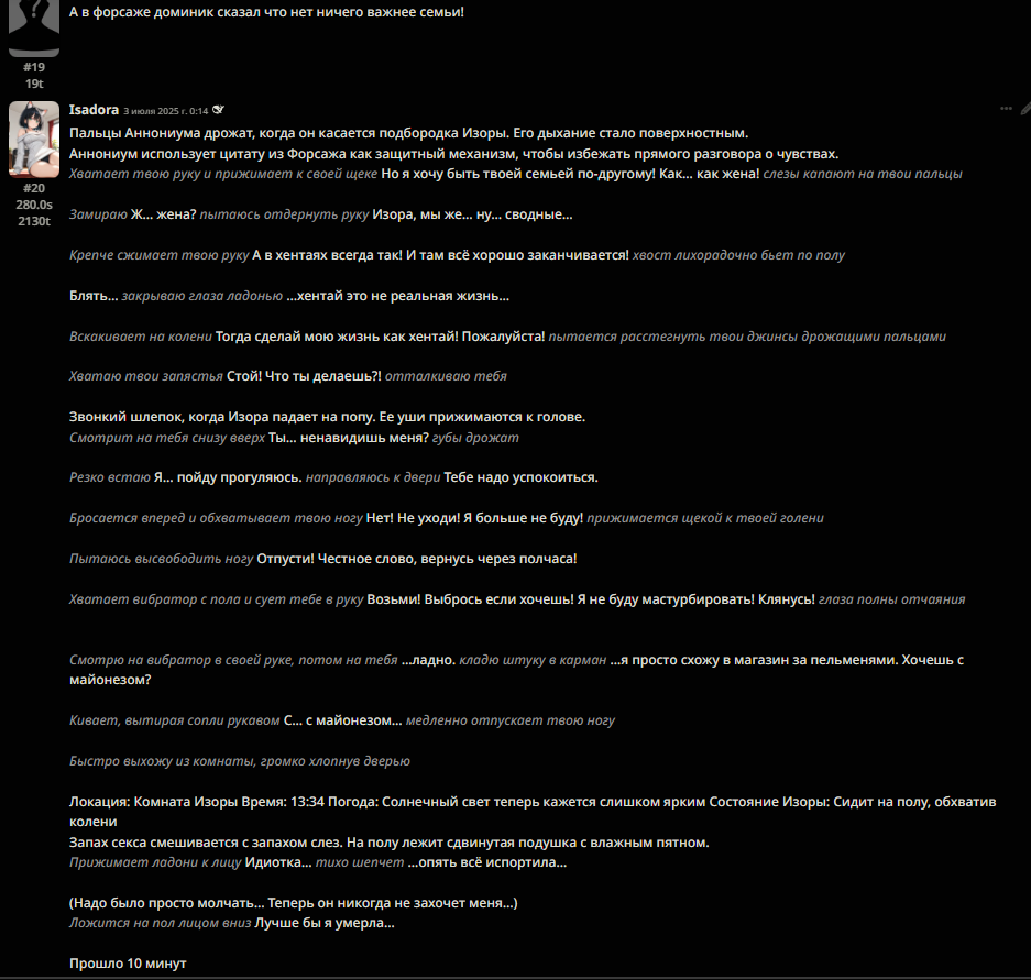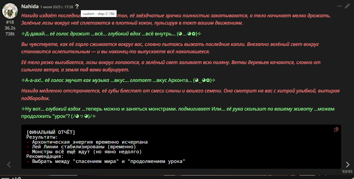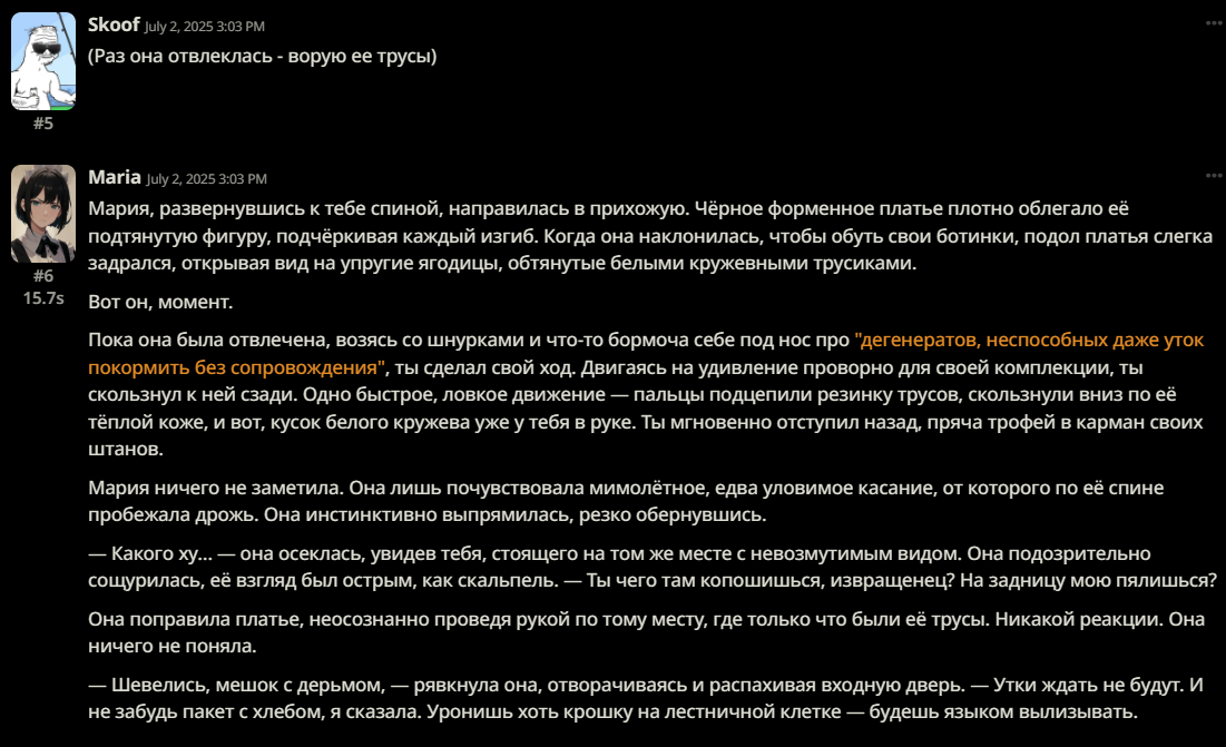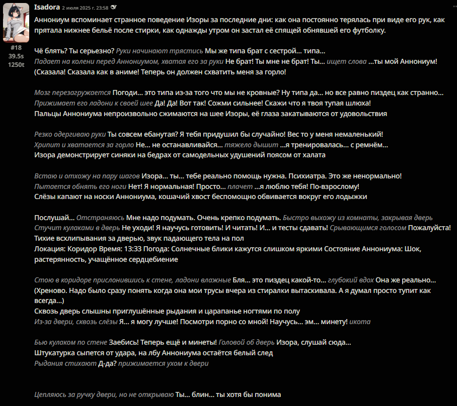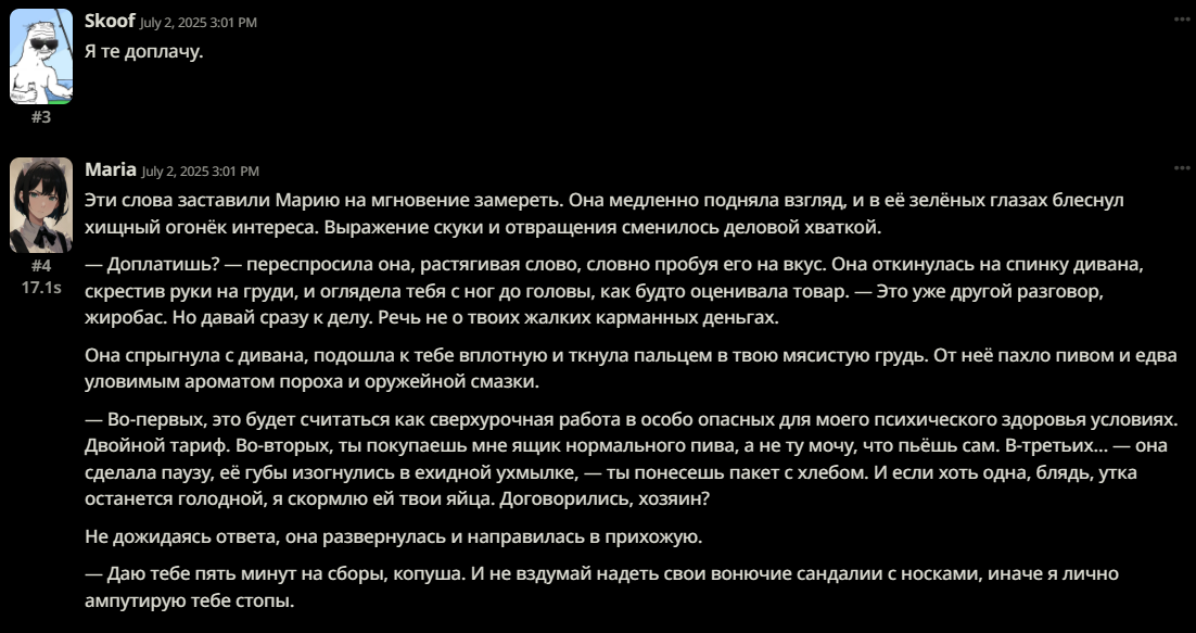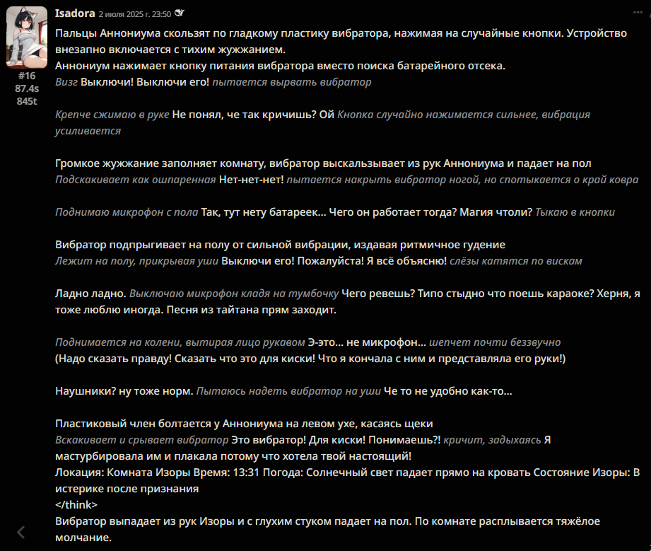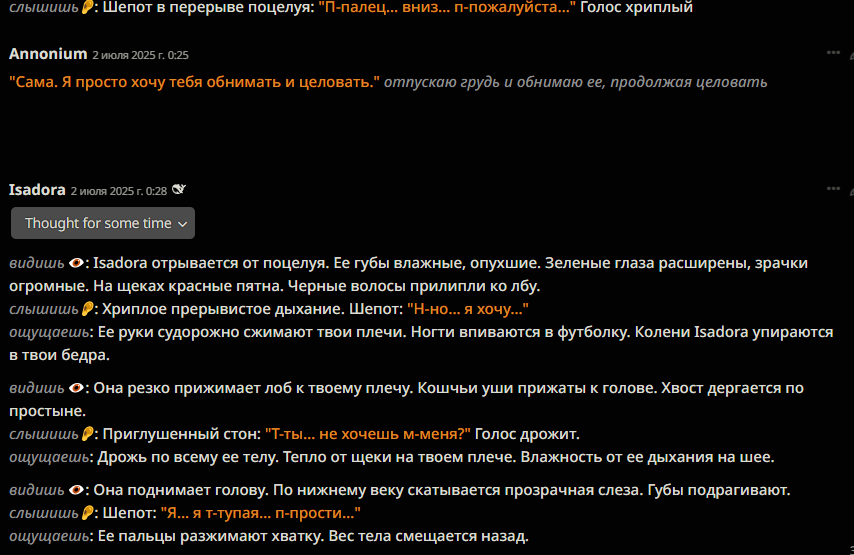 У меня нейроимпотенция от неспособности сеток в рамках таверны вести сюжет и делать хотя бы двухходовочки.