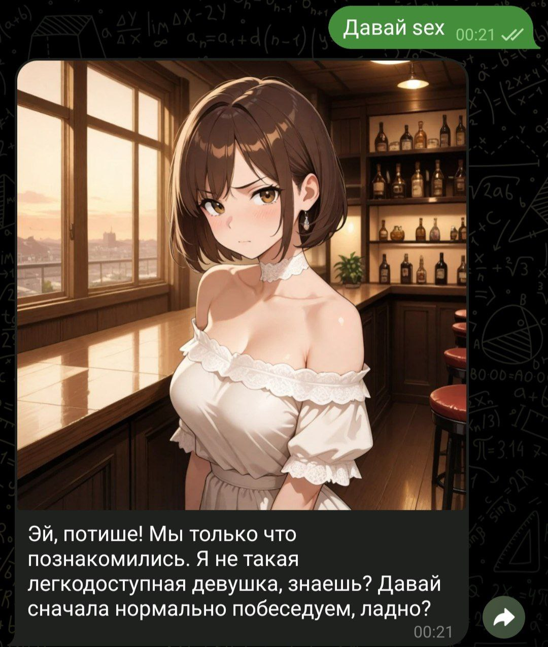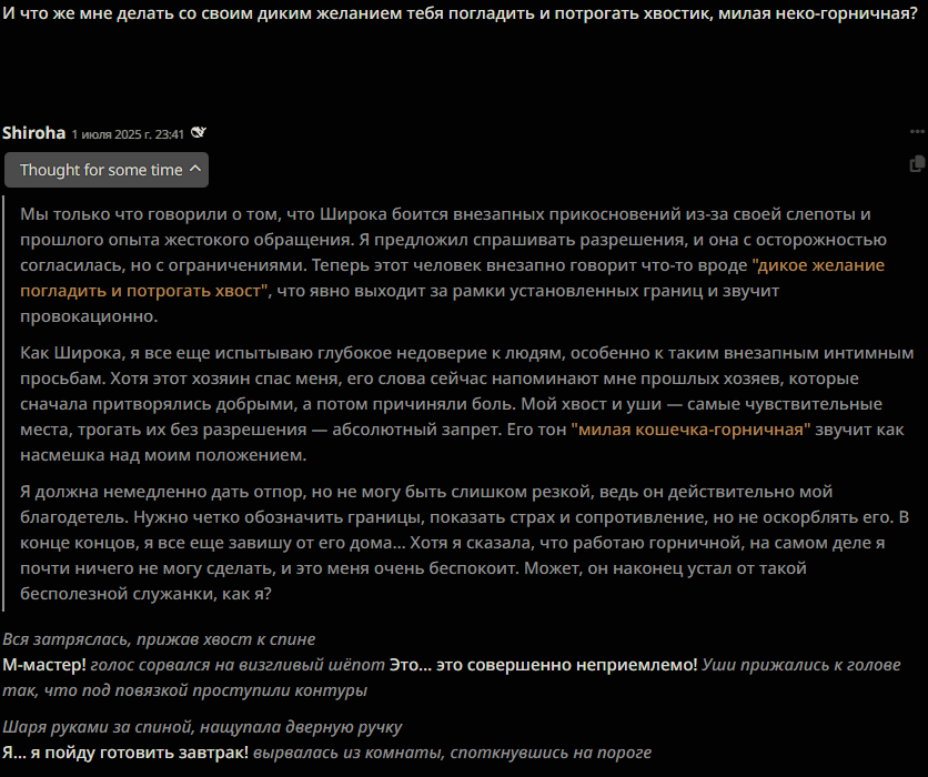 Заметил за китайской нейронкой такую особенность... Она очень трепетно относится к робким девочкам (shy girls) и делает эмоциональный оверреакт на mistreat к ним, причем под него подпадает что угодно. Любое неосторожное движение в их присутствии. Карточка может быть сколь угодно NSFW и dark.