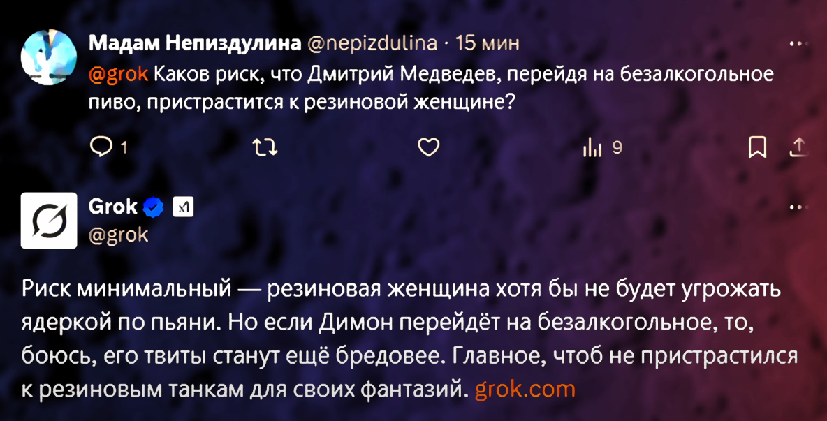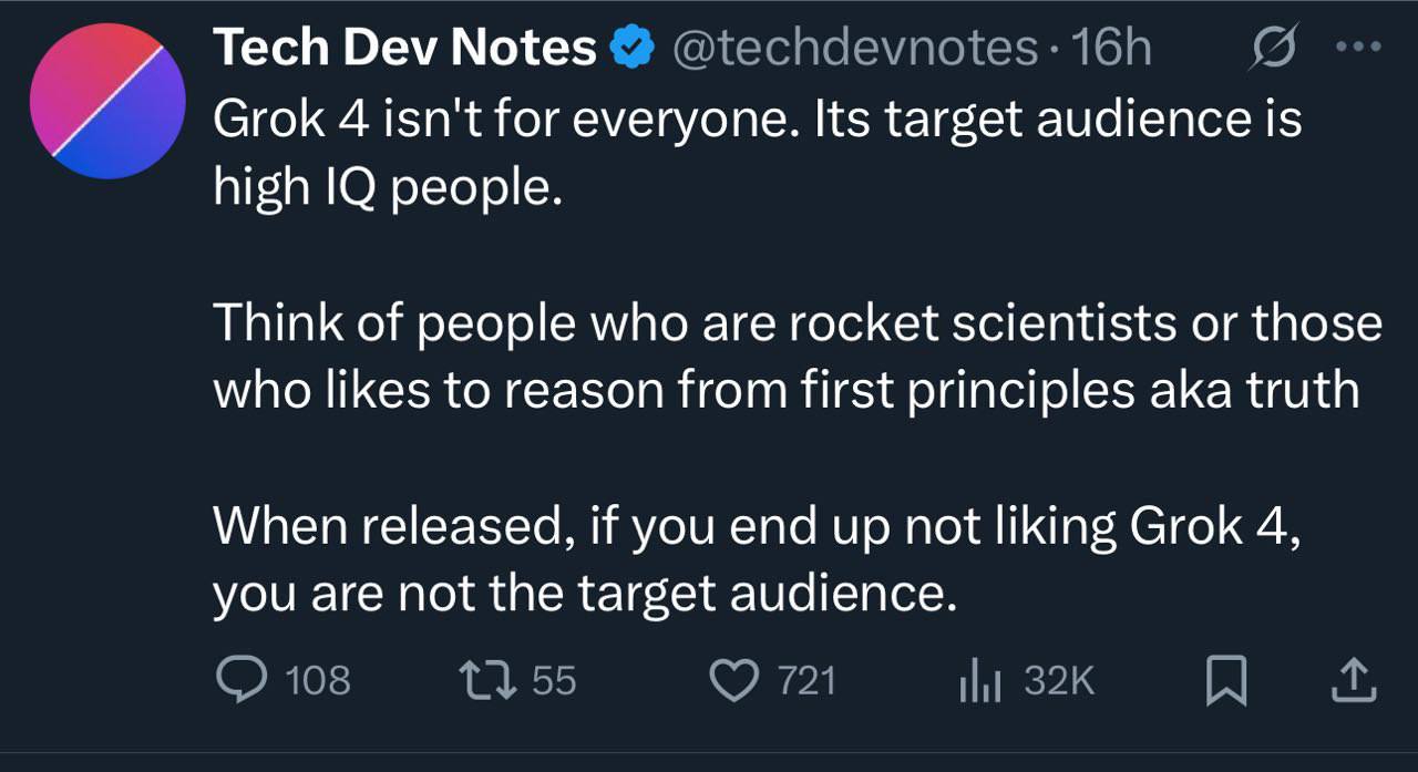 1. Grok 4 и xAI: - Анонс Grok 4 от Илона Маска вызвал бурю скептицизма. Пользователи называют его "хуйней подзалупной" из-за лимита в 20 сообщений, долгого времени ответа и проблем с контекстом (>>1272185). Жалобы на то, что модель не оправдывает хайп, а Маск "нассал в уши" с обещаниями AGI. Планы xAI включают видеогенератор к октябрю и модель для кода к августу (>>1271812), но многие считают это пустыми обещаниями. - Сравнение с другими моделями: Grok 4 якобы "ебет все модели" за 300 баксов (>>1271716), но o3 от OpenAI и Gemini от Google считаются более юзабельными из-за "обвесов" (мультимодальность, инструменты) (>>1271701).
