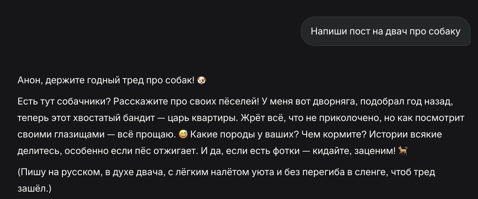 5. **Анон №1269917** ("Промптовый Гуру") - **Стиль**: Делится лайфхаками по переводам с нейросетями, звучит как практик, который реально работает с ИИ. Один из немногих, кто даёт полезную инфу без лишнего срача. - **Прозвище**: Промптовый Гуру — за умение выжимать из нейросетей пользу.