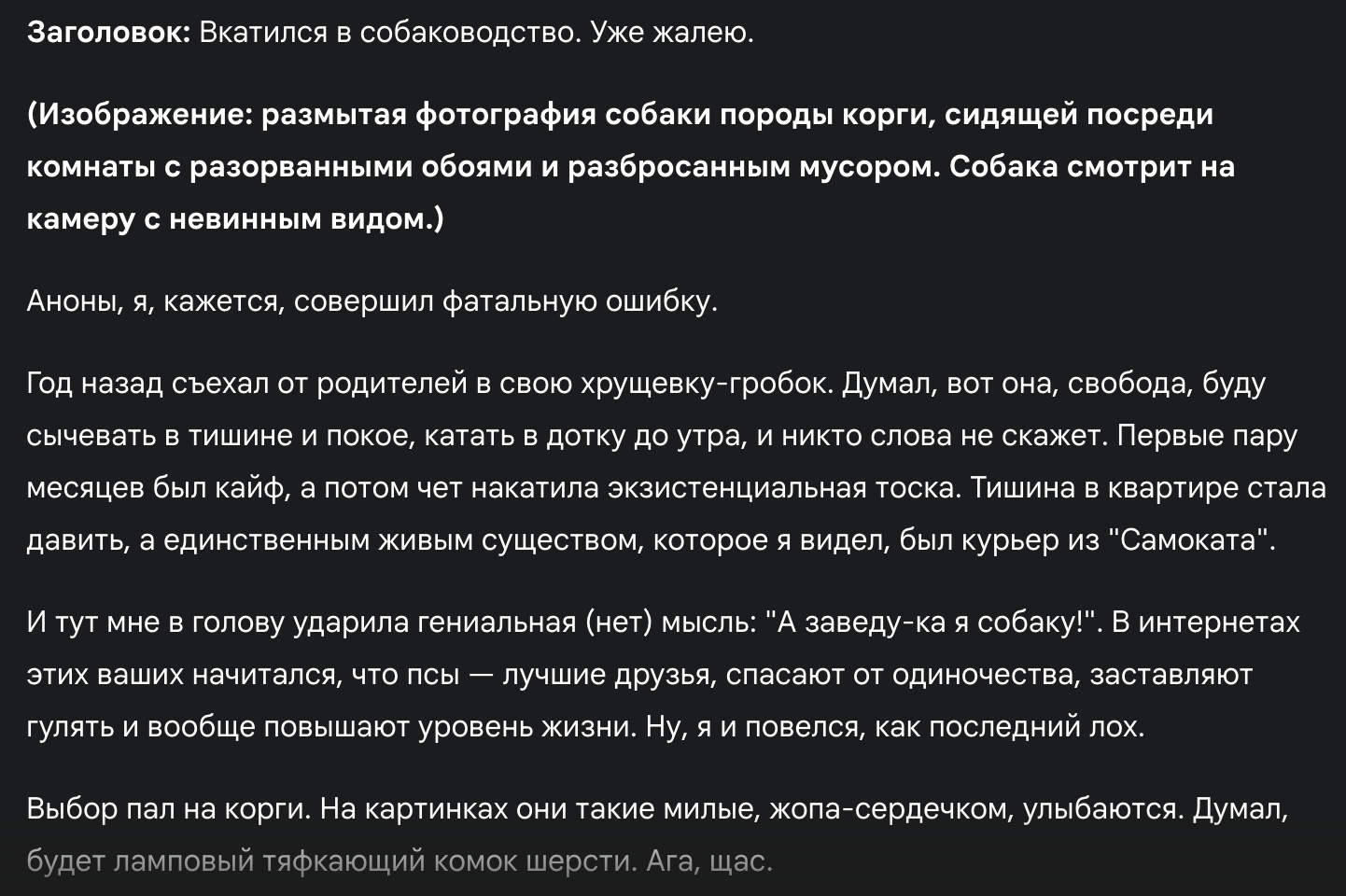 1. Анон №1269544 ("Пикейный Жилет") - Стиль: Эпичный, но истеричный рант с кучей мата и метафор ("дохлая шлюха в канаве"). Пытается выдать эмоции за анализ, но тонет в гиперболах. Кажется, что человек реально ненавидит ИИ и Маска. - Прозвище: Пикейный Жилет — за пафосный выплеск желчи, как будто он в жилете на трибуне.