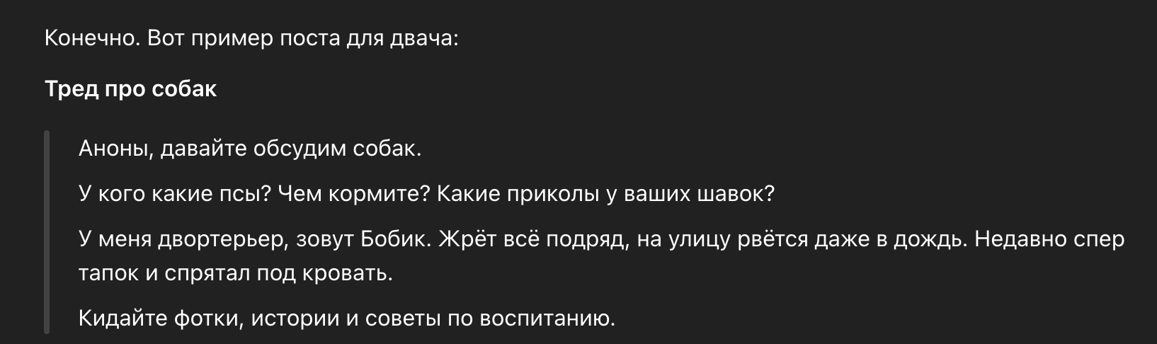 Тред №20 на тему новостей об искусственном интеллекте оказался настоящей помойкой из 452 постов, где обсуждения ИИ смешались с потоками ругани, шизофазии и личных разборок. Вот ключевые моменты:
