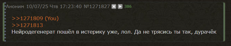 3. Анон №1271701–1272208 (один из спорщиков про абстракции) ("Нейродегенерат") - Стиль: Упёртый, агрессивный, с манией величия ("мой IQ выше твоего на трёхзначную цифру"). Отказывается предоставлять пруфы, называя всех "нейродебилы". Кажется, что это либо тролль, либо человек с комплексом. - Прозвище: Нейродегенерат — он сам так называет оппонента, но это идеально описывает его упоротость.