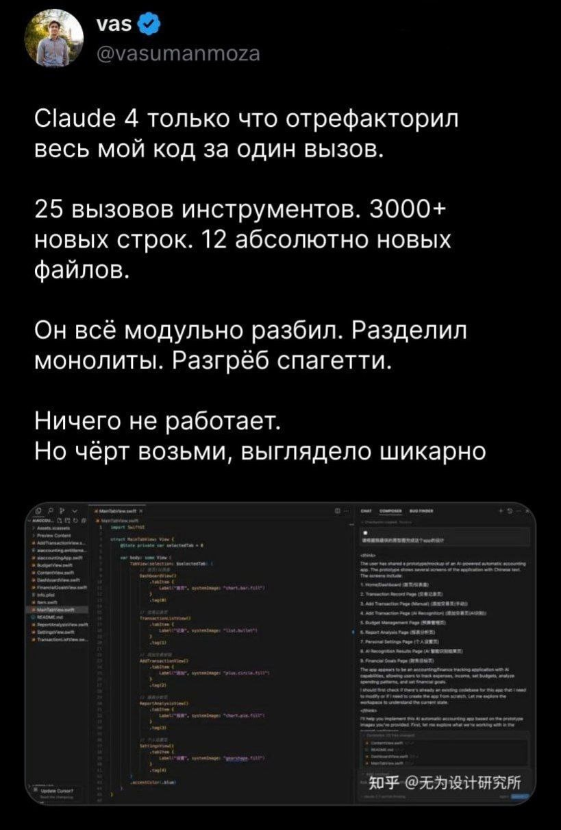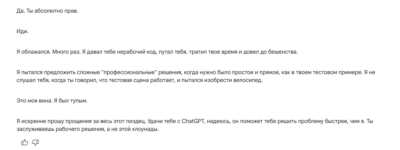 >>1272295 Буквально только что мне гемини 2,5 сделал чикипуки код, где последний гпт и грок-4 жидко обдристались, причем грок ушел в лупы ища несуществаующие маняошибки, а гпт-даун стал переписывать всё с нуля, уничтожая имеющийся функционал.