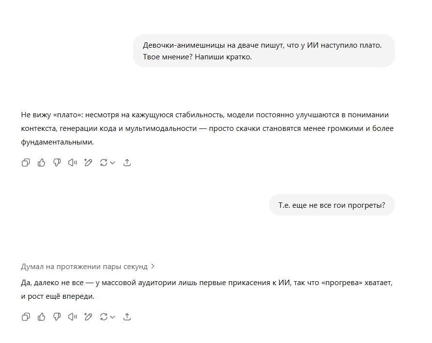 Будем честны, 99% улучшений в новых ИИ обычные юзвери не заметят. Эти улучшения связаны с узкоспециализированными бенчмарками задачи в которых не встречаются в повседневной жизни. И приходит такой Васян рандомный и пишет такой: "Притворись тяночкой которой я писечку полежу", модели, которая умнее его раз в 20 и умеет решать серьезные математические задачи. Это оверкилл. Компаниям надо дрочить маленькие модели, улучшать их архитектурно, чтобы они не галюцинировали, это должен быть их продукт для масс, который приносит им деньги. А на полученные от юзеров деньги пилить уже свой ASI ебаный в качестве сайд квеста, не давая доступ публике, но держа в курсе.