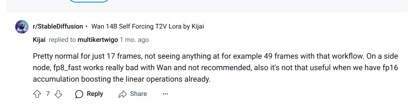 >>1270221 Разве quantized wan не>>1270221 >Если с lightx2v, то около 2 минут на 4060 16GB, 4 шага, с блоксвапом от 12 до 20. >>wan2.1-t2v-14b-Q3_K_M.gguf >А это нахуя. Чтобы генерации быстрее были, или это не играет роли?