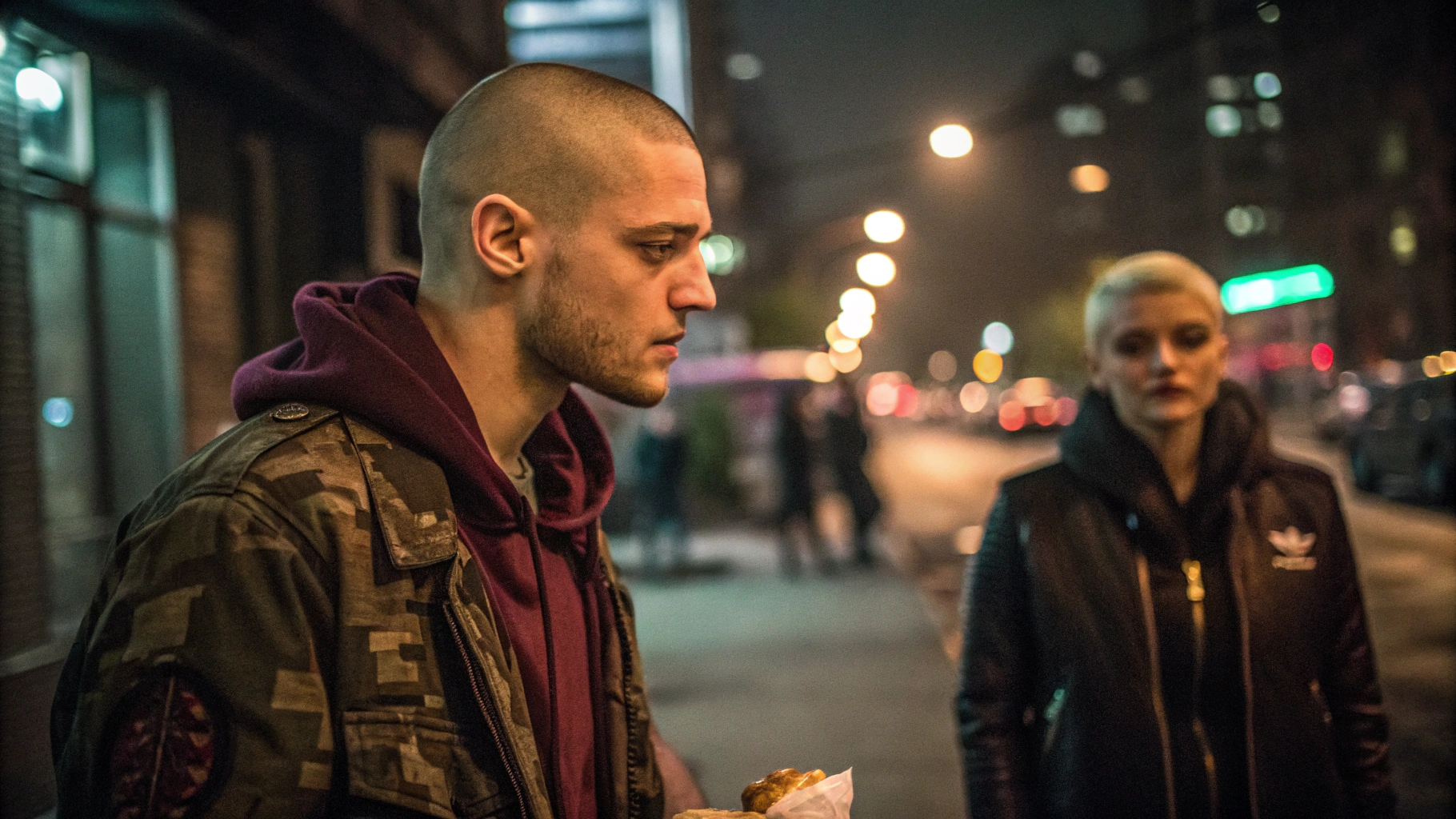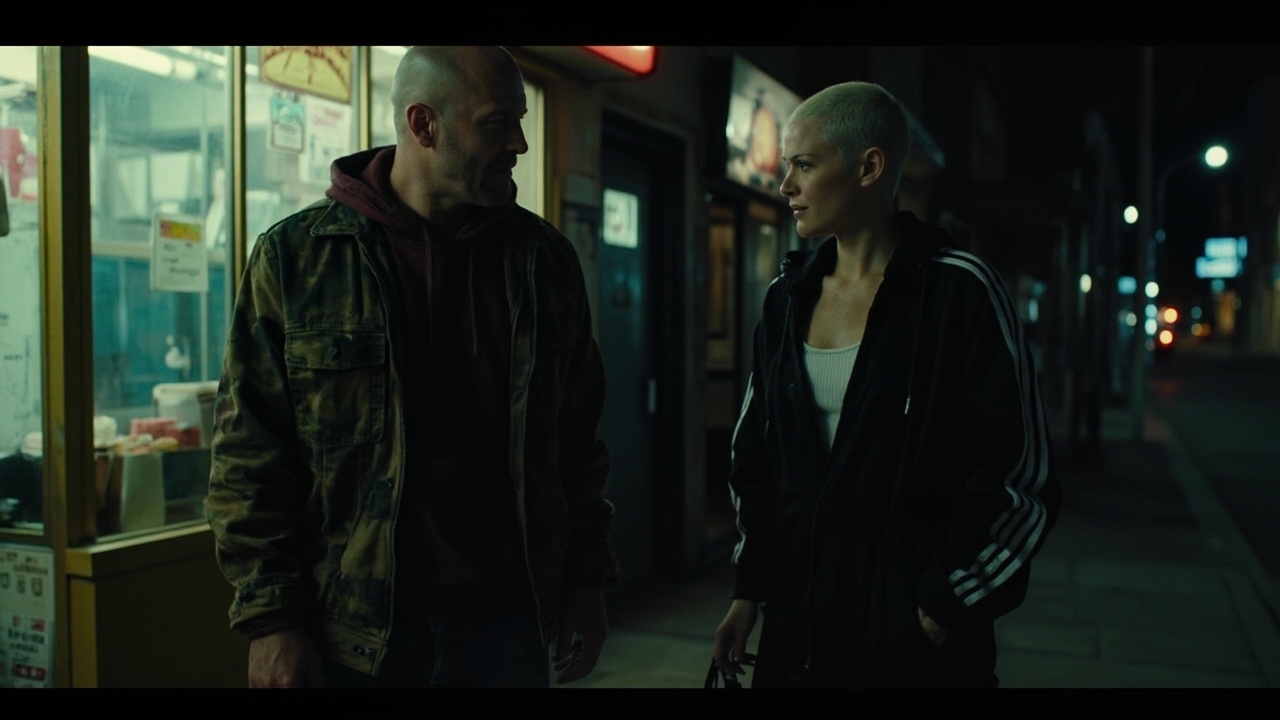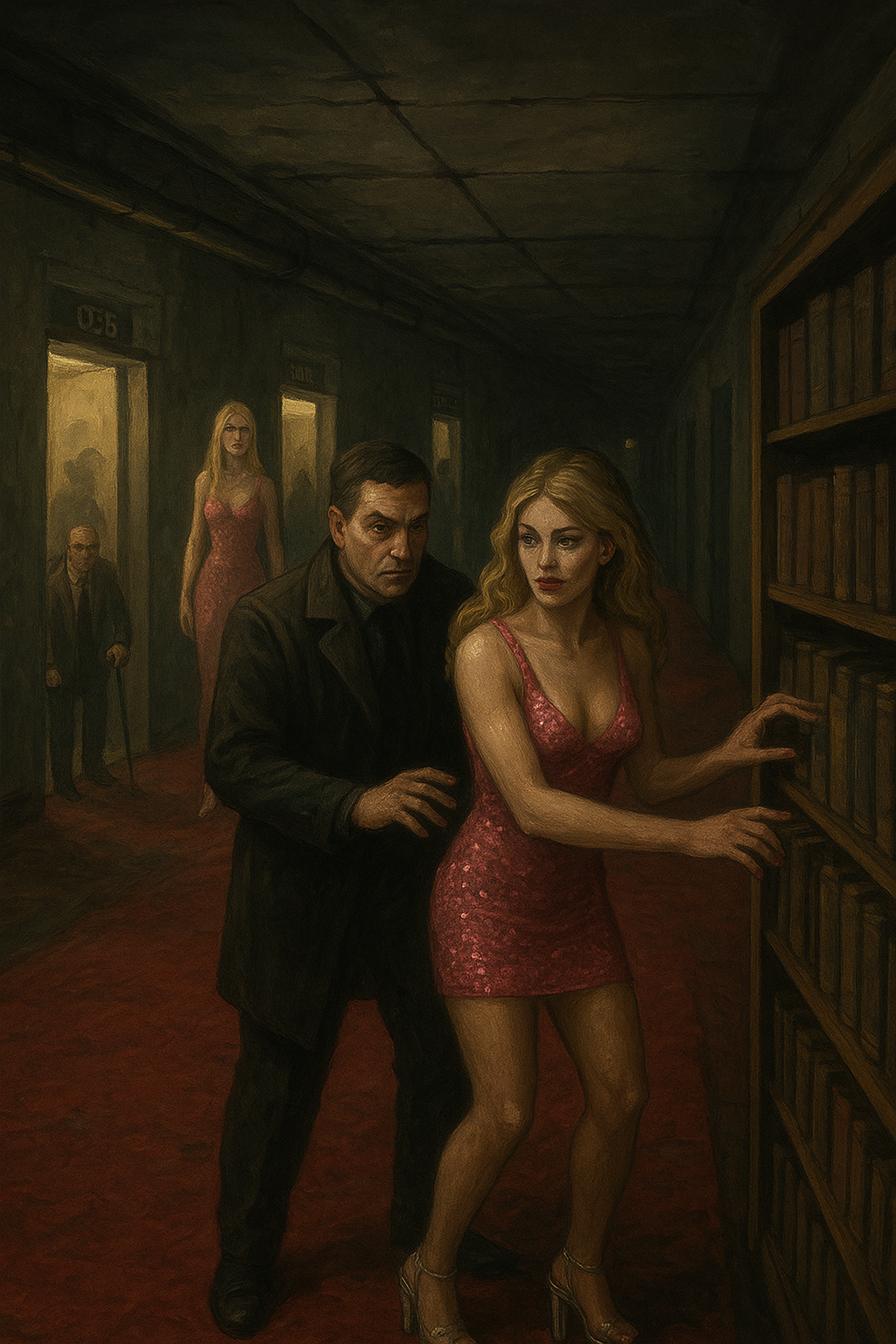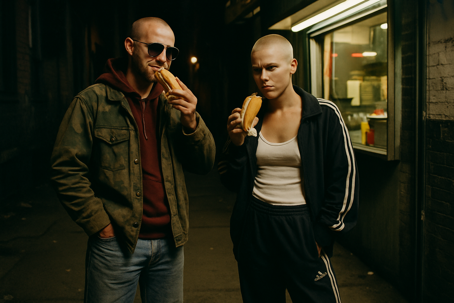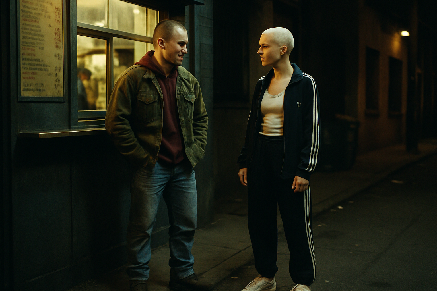It is 1:30:17 AM. She is stumbling slightly while walking down a narrow, deserted alley, her back to us as she leans heavily on the arm of the man who is guiding her away from the faint, pulsating glow of a doorway. Her head is bowed, and her unkempt hair partially obscures her face, her gait unsteady. The alley is dimly lit by a single, high-mounted security light that casts long, distorted shadows on the cracked pavement and overflowing rubbish bins stacked against a graffiti-covered wall.