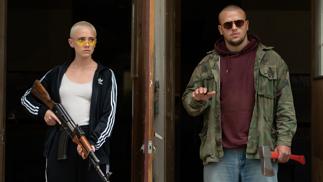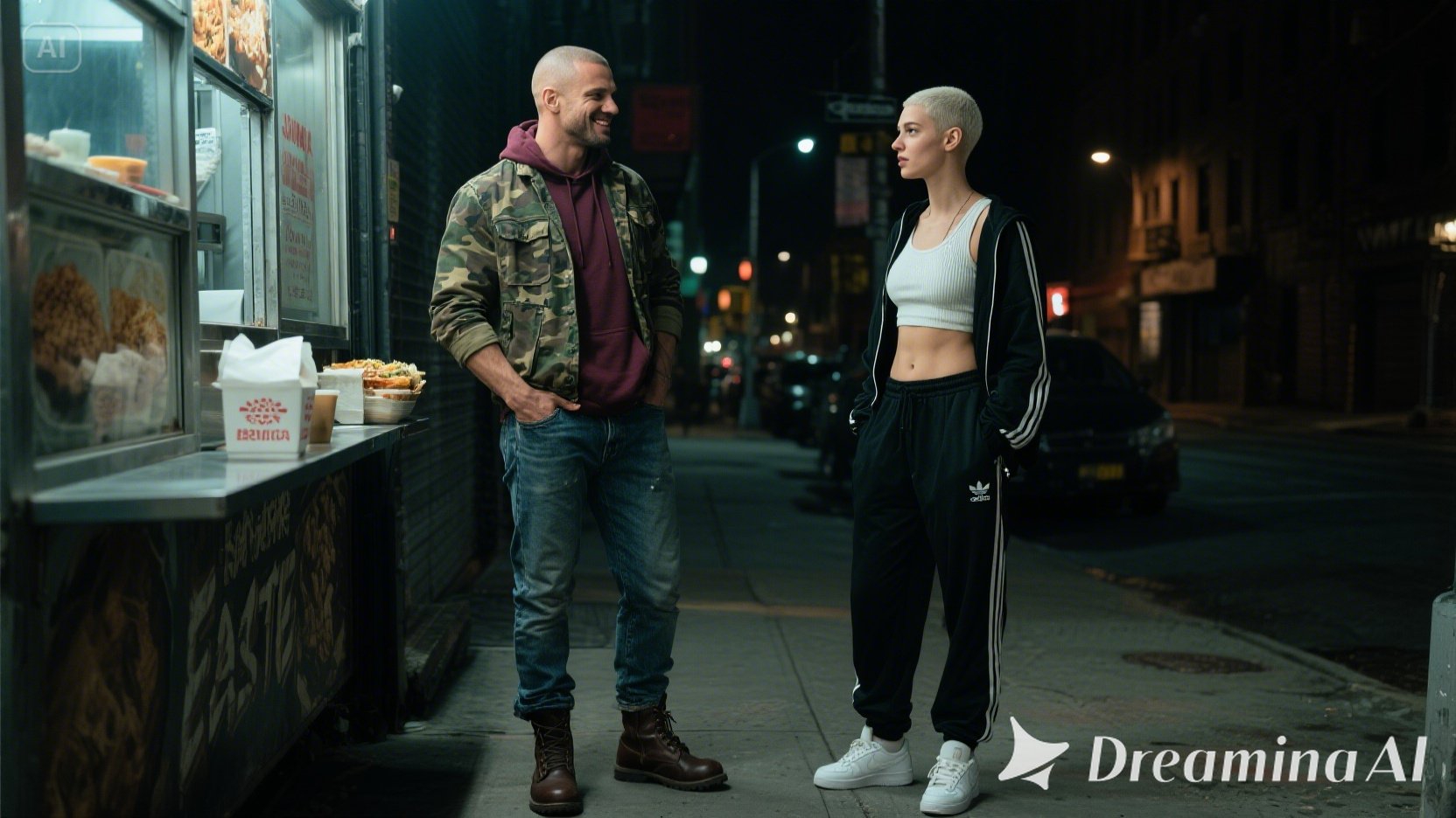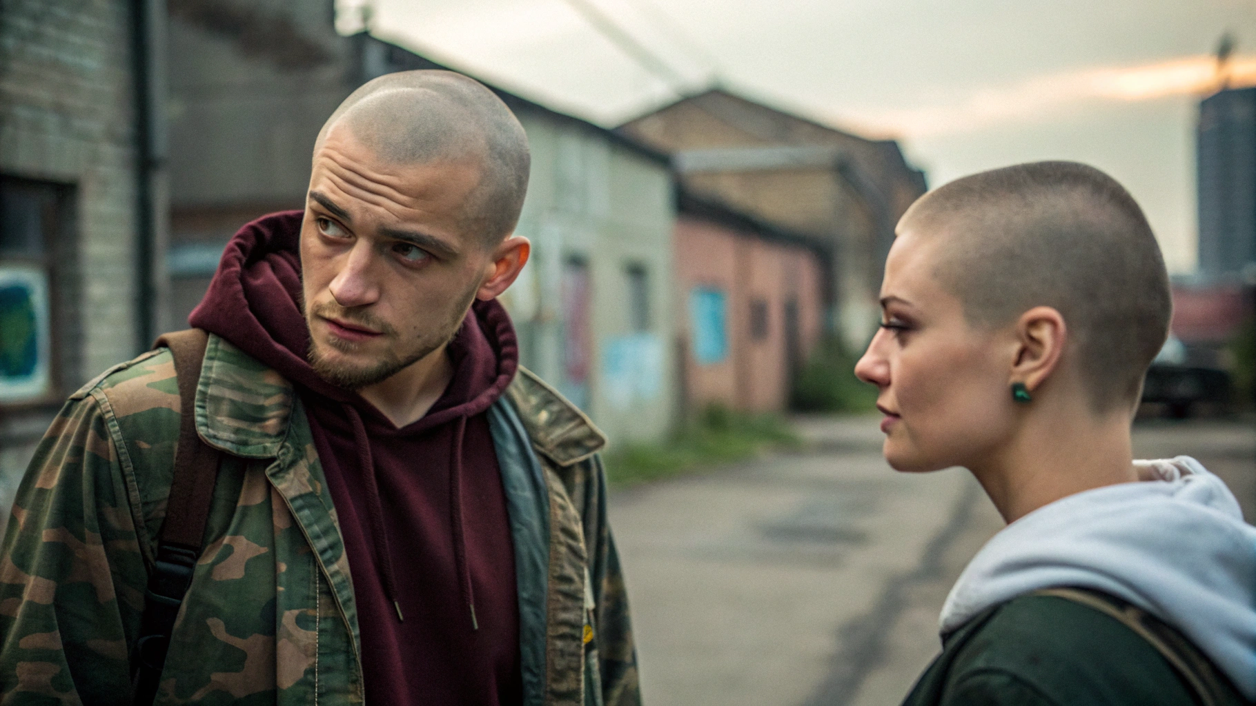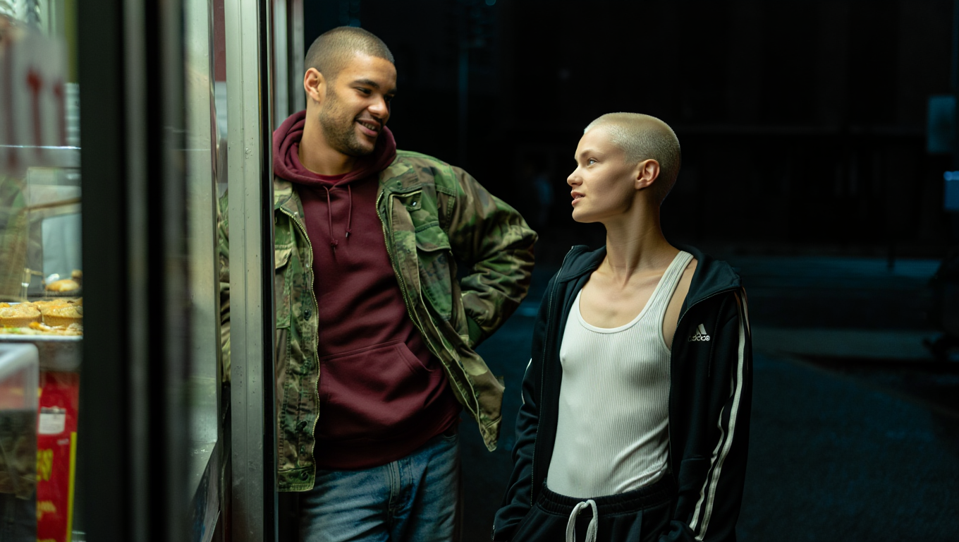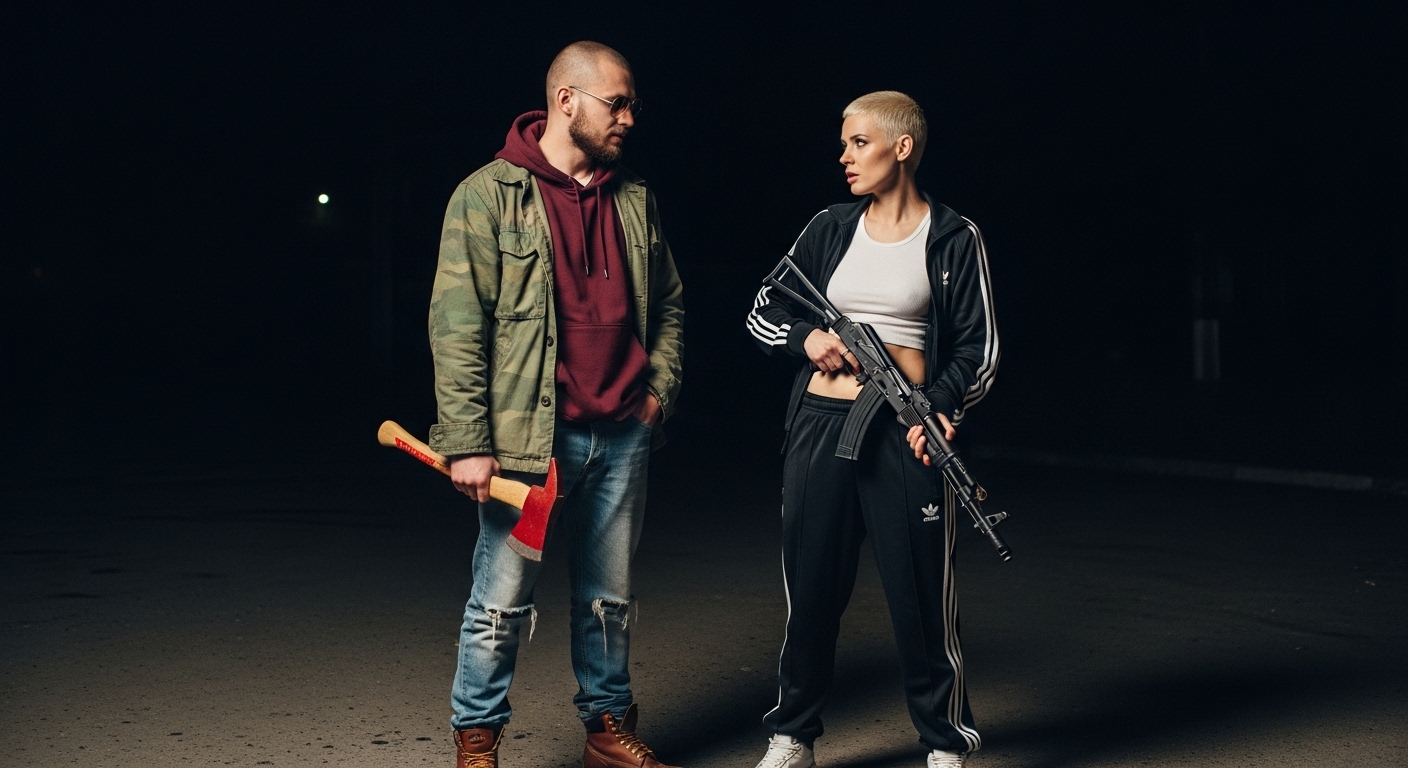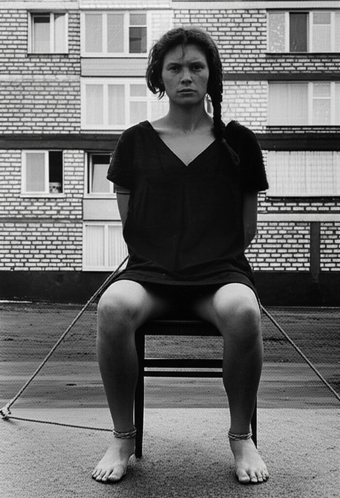 It is 1:30:17 AM. She is stumbling slightly while walking down a narrow, deserted alley, her back to us as she leans heavily on the arm of the man who is guiding her away from the faint, pulsating glow of a doorway. Her head is bowed, and her unkempt hair partially obscures her face, her gait unsteady. The alley is dimly lit by a single, high-mounted security light that casts long, distorted shadows on the cracked pavement and overflowing rubbish bins stacked against a graffiti-covered wall.
