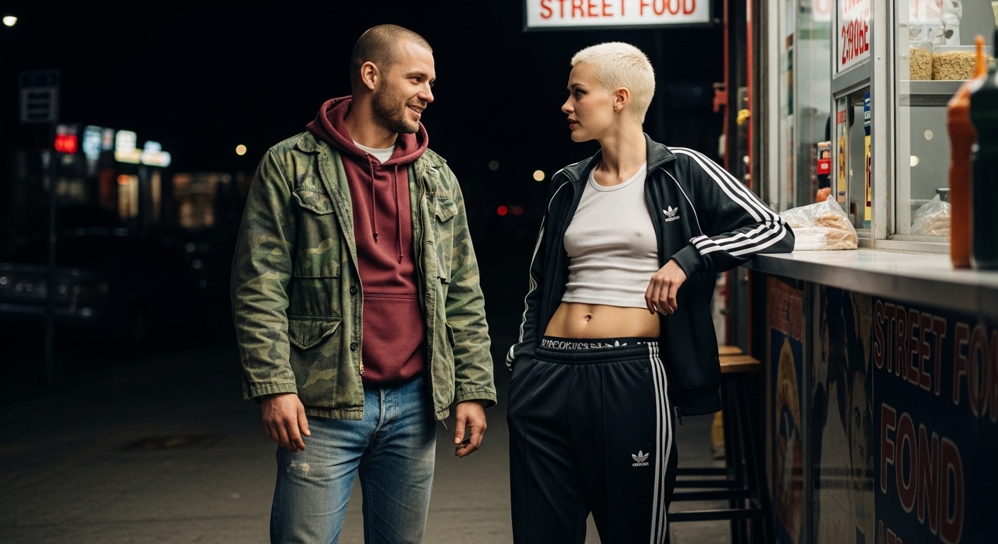 Возраст кстати тоже неплохо отрабатывает 20/30/40/50 It is late evening. She is walking slowly down a busy, narrow street in the resort town, looking at the bright displays of souvenirs and leather goods in the shop windows. The street is crowded with other tourists, and the scene is brightly lit by the harsh, white light from the many open-fronted shops.
