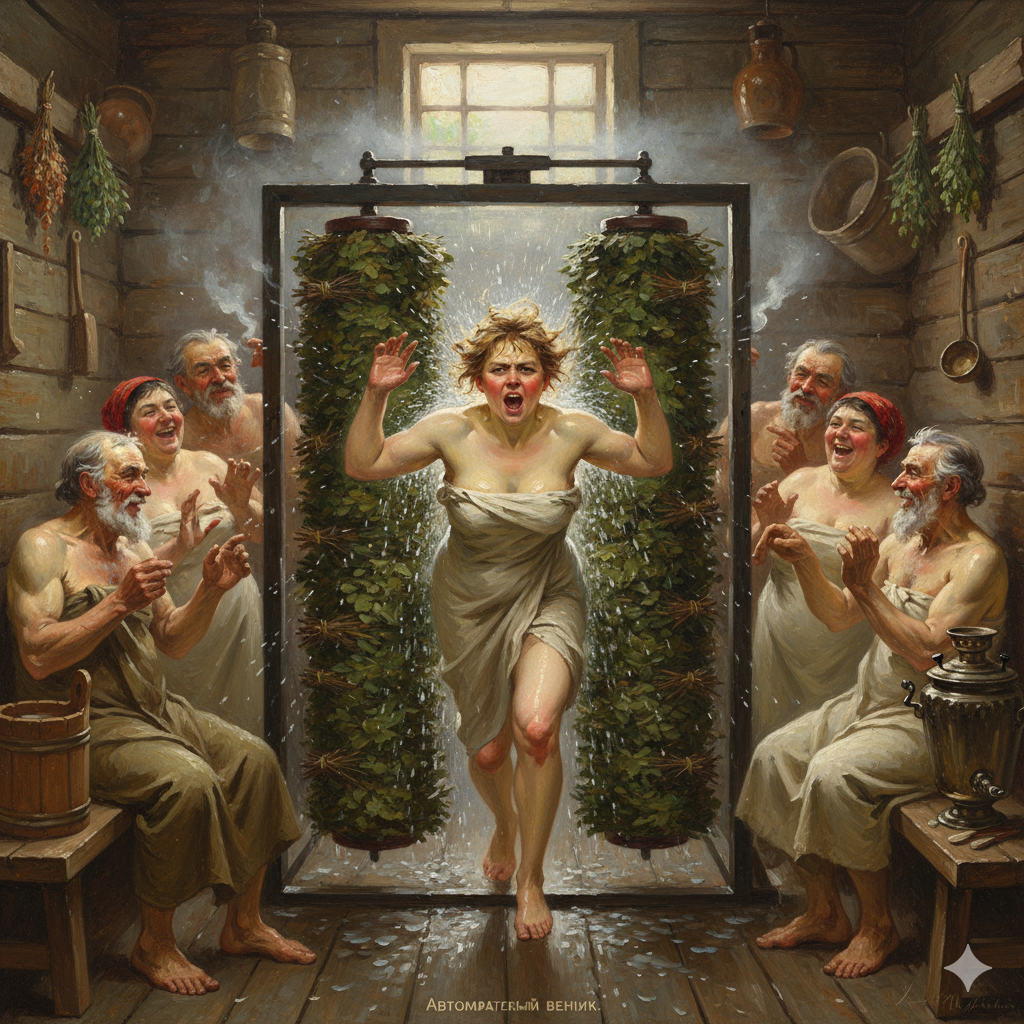 >>1371220 A masterpiece oil painting in the style of 19th-century Russian Realism. In a traditional Russian village banya. One young woman lies on a bench on her stomach. Another standing young woman swings a venik.